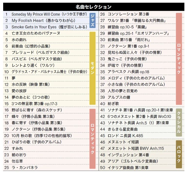 F. チャーチルの「Someday My Prince Will Come(いつか王子様が)」や、E. W. エルガー「愛の挨拶」など、名曲50曲を収録。鑑賞から練習まで音楽を身近に楽しめます。