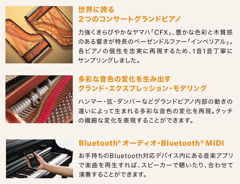 世界で活躍する2つのコンサートグランドピアノの音を忠実にサンプリング。ヘッドホン使用時でも自然な響きが楽しめます。また、Bluetooth機能を搭載しており、スマホやタブレットと接続することで音楽鑑賞や練習の幅が広がります。