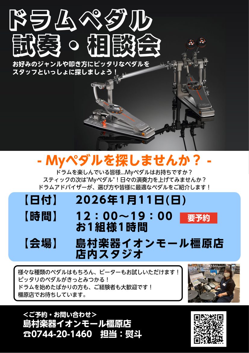 ![みなさんこんにちは。島村楽器橿原店の熨斗です。 突然ですが、ドラマーの皆さま、マイペダルはお持ちですか?キックペダルは身体と楽器を繋ぐ重要な機材です!けどどれがいいのかよく分からないかも……そんなお悩み、解決します!ピッタリのペダルがきっと見つかる、試奏・相談会のご案内です。 CONTENTSドラム […]](https://www.shimamura.co.jp/shop/kashihara/wp-content/uploads/sites/128/2025/12/20251218-shima251218-01281.jpg)