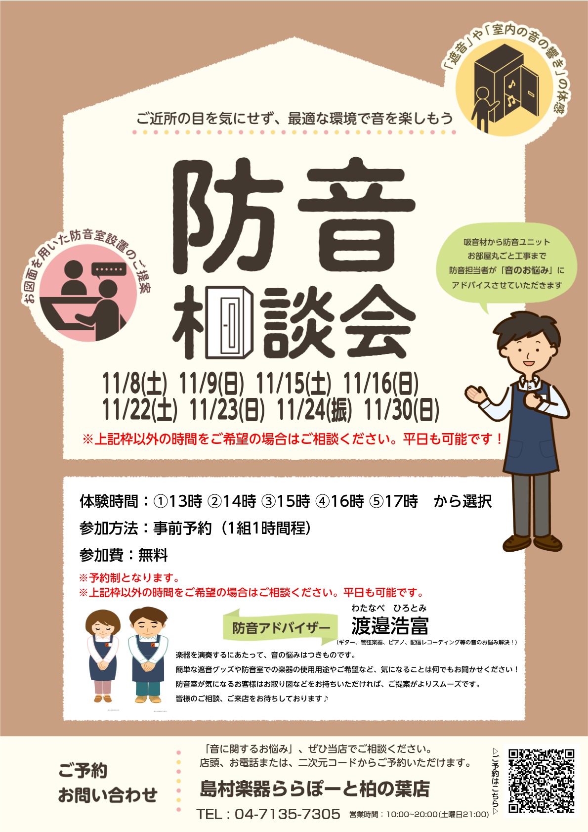 ![2025年06月27日 CONTENTS 防音説明会概要 「楽器を思いっきり家で演奏したい!」と思ったことはございませんか…? 防音相談会開催の3日間では、当社防音アドバイザー渡邉がより詳しくお客様のライフスタイルに合った防音のご提案をさせていただきます。「楽器演奏の環境にお困りの方」「まずは防音に […]](https://www.shimamura.co.jp/shop/kashiwa-h/wp-content/uploads/sites/82/2025/06/20251002-b83e17ce3df0bb4156edb5c2ddbcb4f9.png)