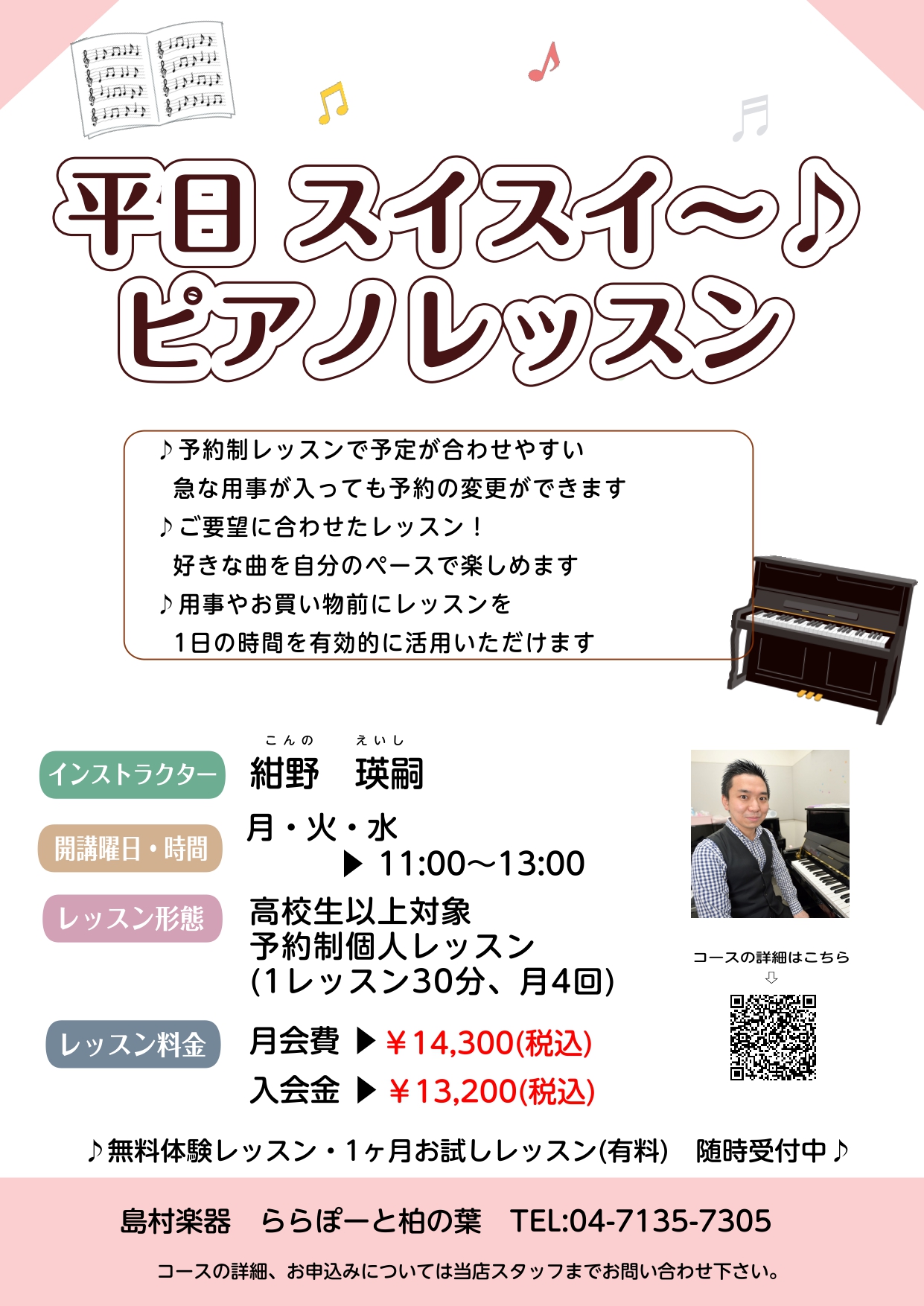 平日お昼にのんびりとピアノのレッスンなどいかがでしょうか🌟