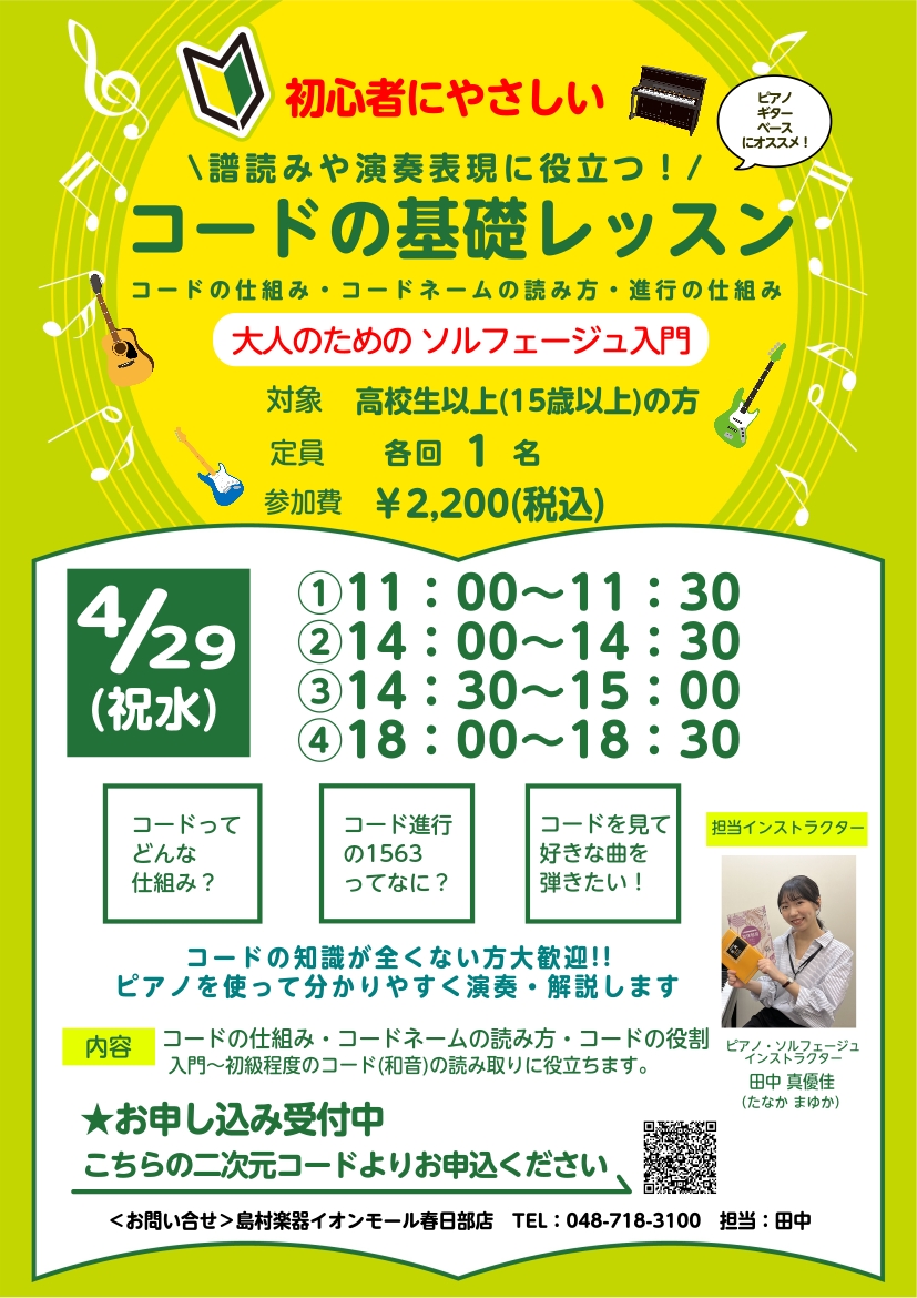 入門・初心者の方にこそ受けていただきたい、コードの基礎レッスン体験セミナーを開催します。