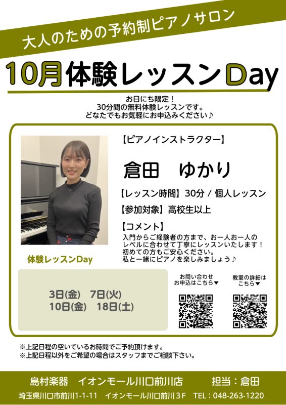 CONTENTS大人のための予約制レッスン~ピアノサロン~お問合せ大人のためのピアノレッスン~10月体験会Dayのお知らせ~ 皆様こんにちは。島村楽器イオンモール川口前川店ピアノインストラクターの倉田です。いよいよ涼しく過ごしやすい日も多くなり、秋がやってきましたね! 秋と言えば・・・芸術の秋!!! […]