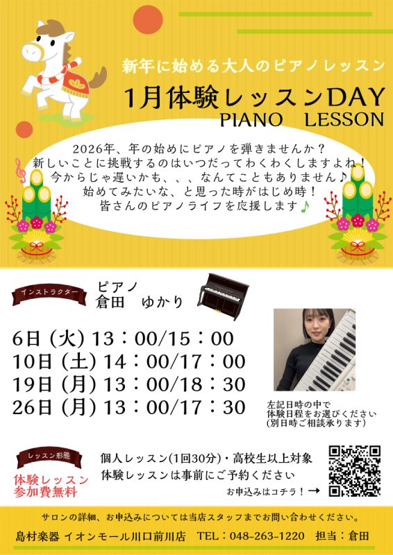 ![CONTENTS1月大人のためのピアノレッスン~体験会Dayのお知らせ~大人のための予約制レッスン~ピアノサロン~お問合せ1月大人のためのピアノレッスン~体験会Dayのお知らせ~ 皆様こんにちは。島村楽器イオンモール川口前川店ピアノインストラクターの倉田です。あっという間に寒くなり、気付いたら冬・・ […]](https://www.shimamura.co.jp/shop/kawaguchi/wp-content/uploads/sites/27/2025/12/20251228-image3-1.png)