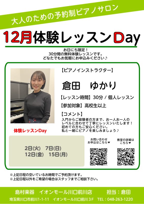 ![CONTENTS12月大人のためのピアノレッスン~体験会Dayのお知らせ~大人のための予約制レッスン~ピアノサロン~お問合せ12月大人のためのピアノレッスン~体験会Dayのお知らせ~ 皆様こんにちは。島村楽器イオンモール川口前川店ピアノインストラクターの倉田です。あっという間に寒くなり、気付いたら冬 […]](https://www.shimamura.co.jp/shop/kawaguchi/wp-content/uploads/sites/27/2024/11/20241125-image3-26.png)