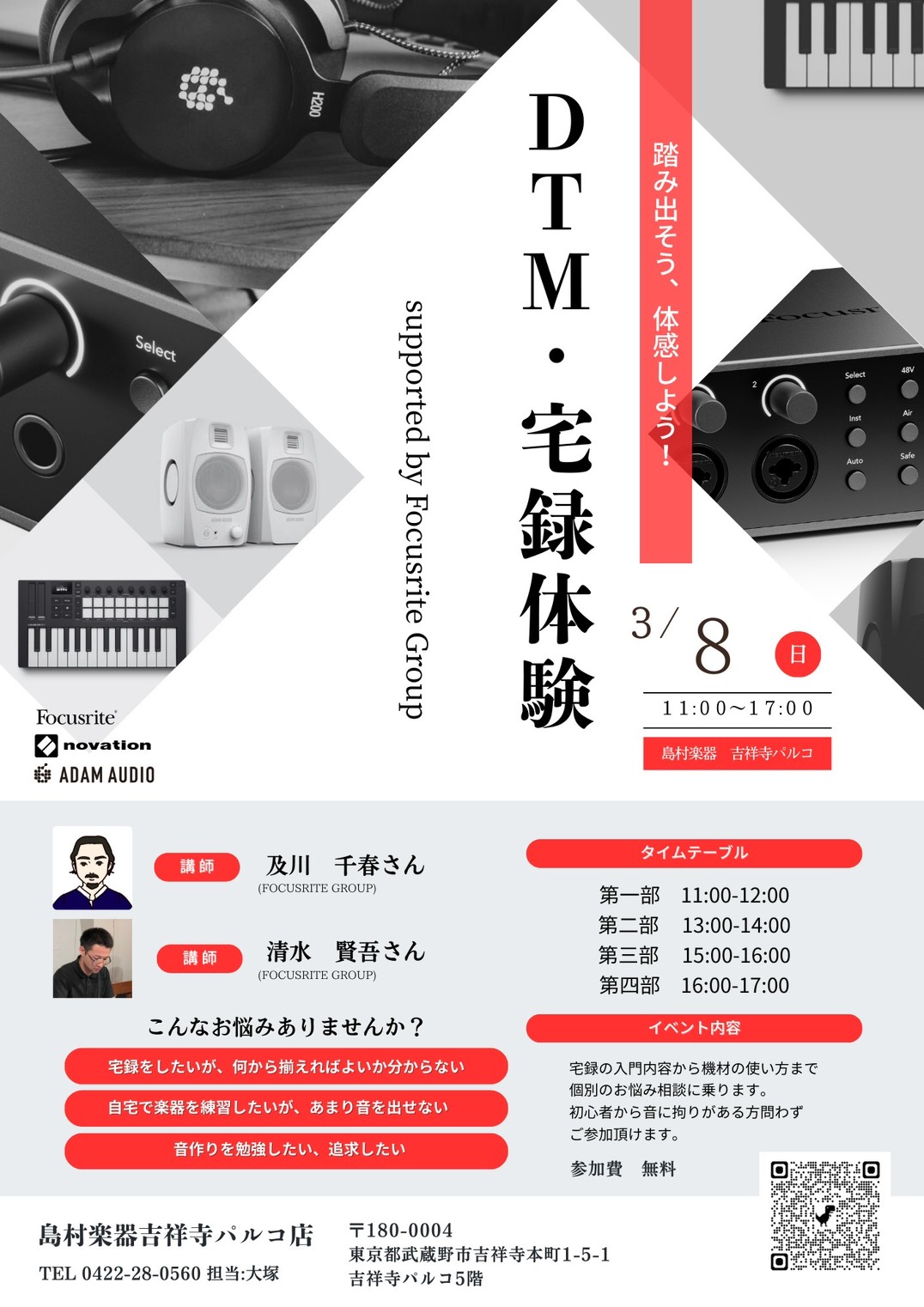 島村楽器吉祥寺パルコ店では、特別に宅録機材に精通するエキスパートのメーカー担当者様をお招きして一人一人のご自宅環境に合わせた機材相談や使い方のレクチャーを開催!
