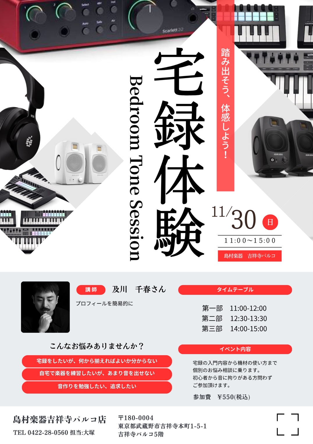 島村楽器吉祥寺パルコ店では、特別に宅録機材に精通するエキスパートのメーカー担当者様をお招きして一人一人のご自宅環境に合わせた機材相談や使い方のレクチャーを開催!