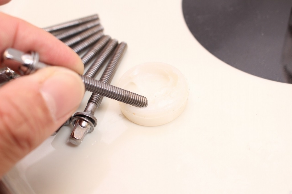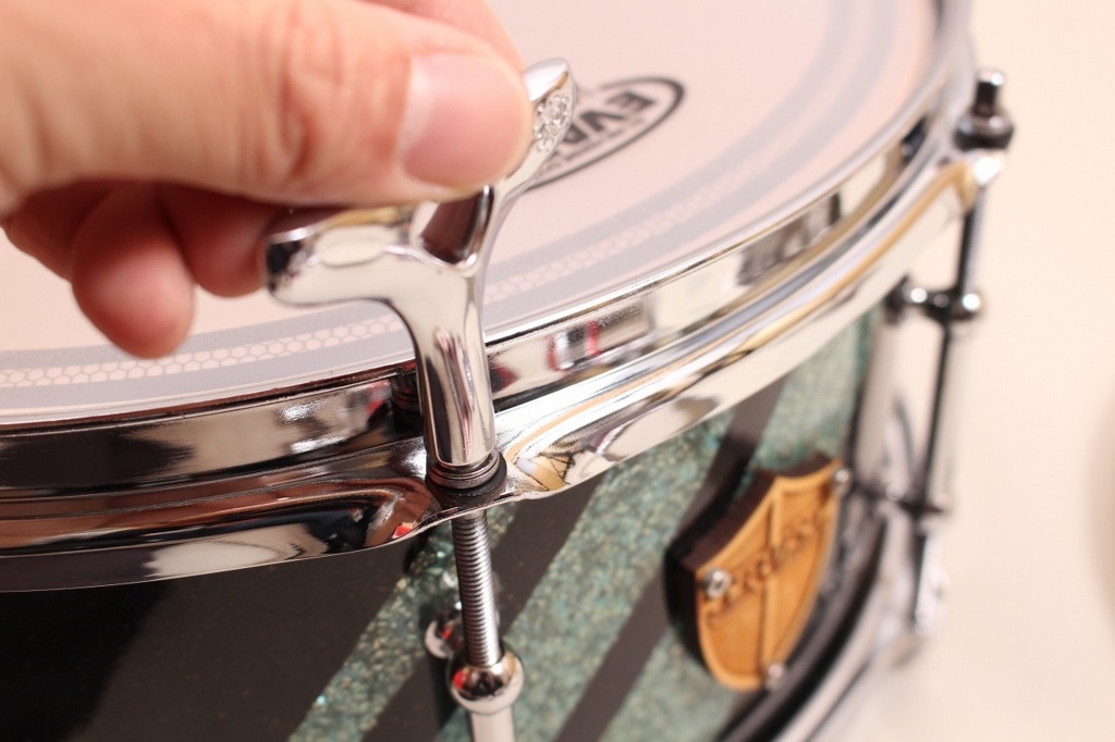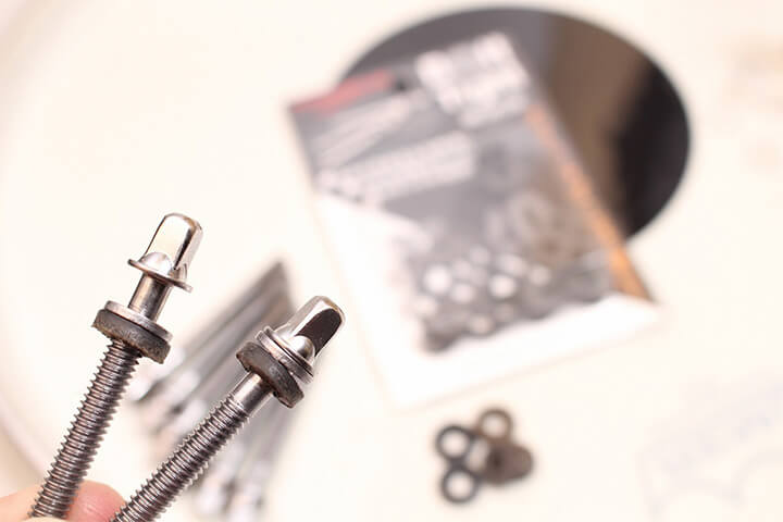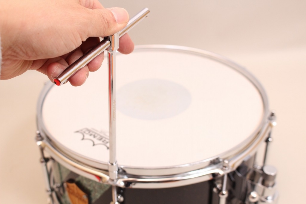 スネアドラムのテンションボルトにCANOPUS社製ボルトタイトを取り付け、お好みの張り具合にチューニングします。チューニングのゆるみを防ぐ効果が期待できます。