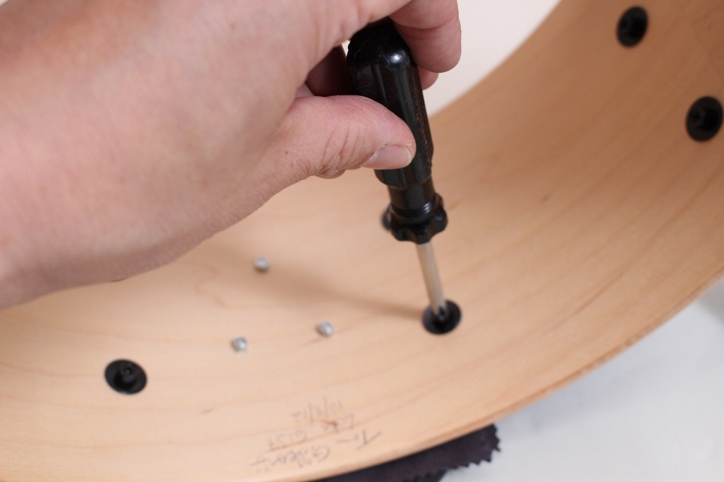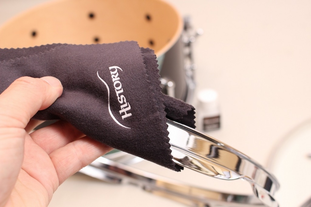 ヘッド交換、楽器の拭き上げに加え、スネアドラムのシェル内部のラグ、ストレイナー固定ボルトの状態をチェックし、必要な場合は増し締め作業を行います。パーツ紛失、破損を防ぐ他、サウンド向上の効果も期待できます。