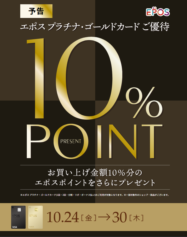 期間中、エポスゴールド・プラチナカードにてお支払いいただくと「お買い上げ金額の10%分のポイントが更にプレゼント」されるお得なキャンペーンを開催しております。