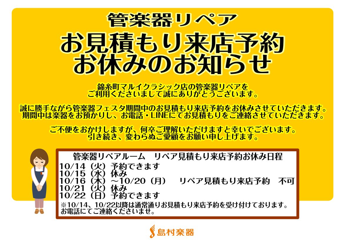 10/16~20は管楽器フェスタのため、見積もり来店予約をお休みさせていただきます。期間中は楽器をお預かりし、順次お見積もりをご連絡させてただきますので、何卒よろしくお願いいたします。