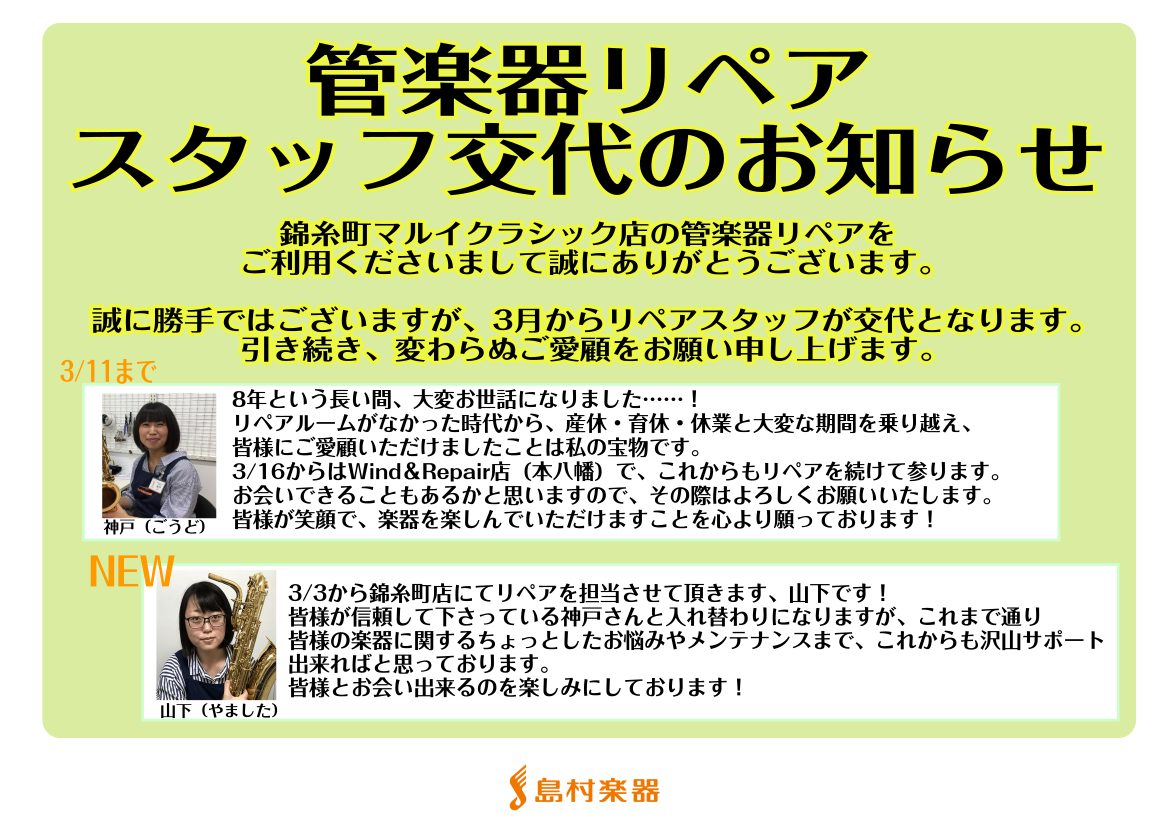 私事ではございますが、人事異動のため3/11よりリペアスタッフが交代いたします。