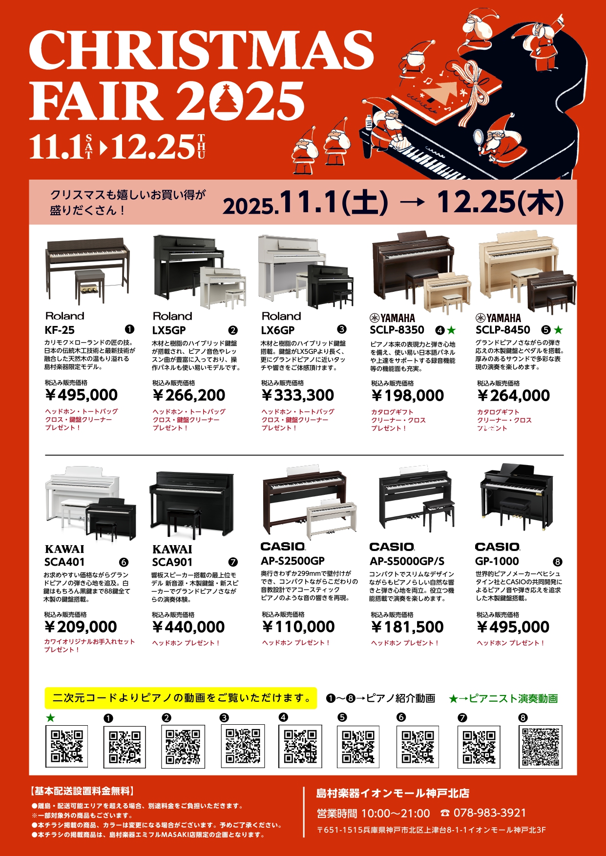 ただいま島村楽器イオンモール神戸北店では、クリスマスピアノフェアを開催中です。