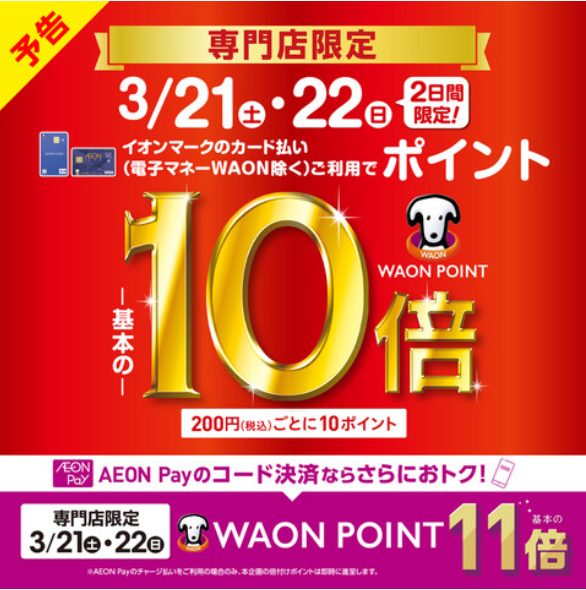 3月21日(土)~22日(日)2日間連続!イオンマークのカード払いご利用でWAON POINT-基本の-10倍【税込200円ごとに10ポイント】