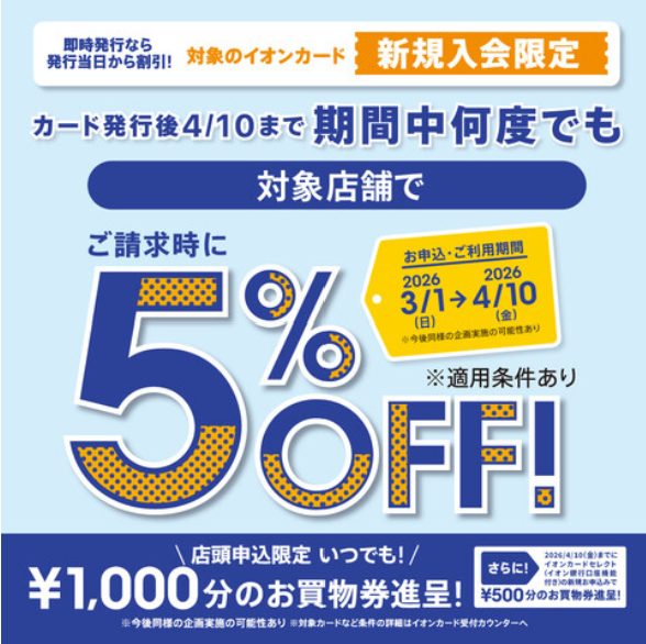 3月1日(日)~4月10日(金)の期間で、イオンカードに新規入会いただいた会員さまを対象に、期間中のまいにち請求時5%OFFとなるキャンペーンを実施いたします。