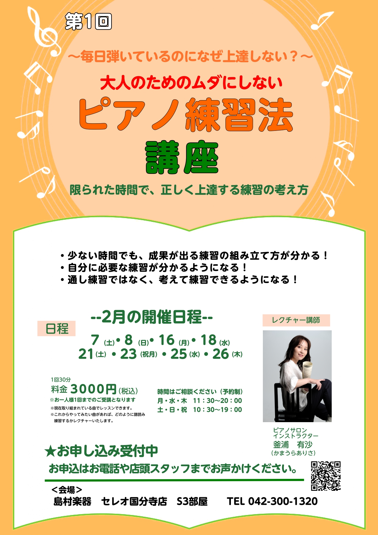 セレオ国分寺店ピアノサロンでピアノレッスンを担当しているインストラクターの釜浦有沙です🎹