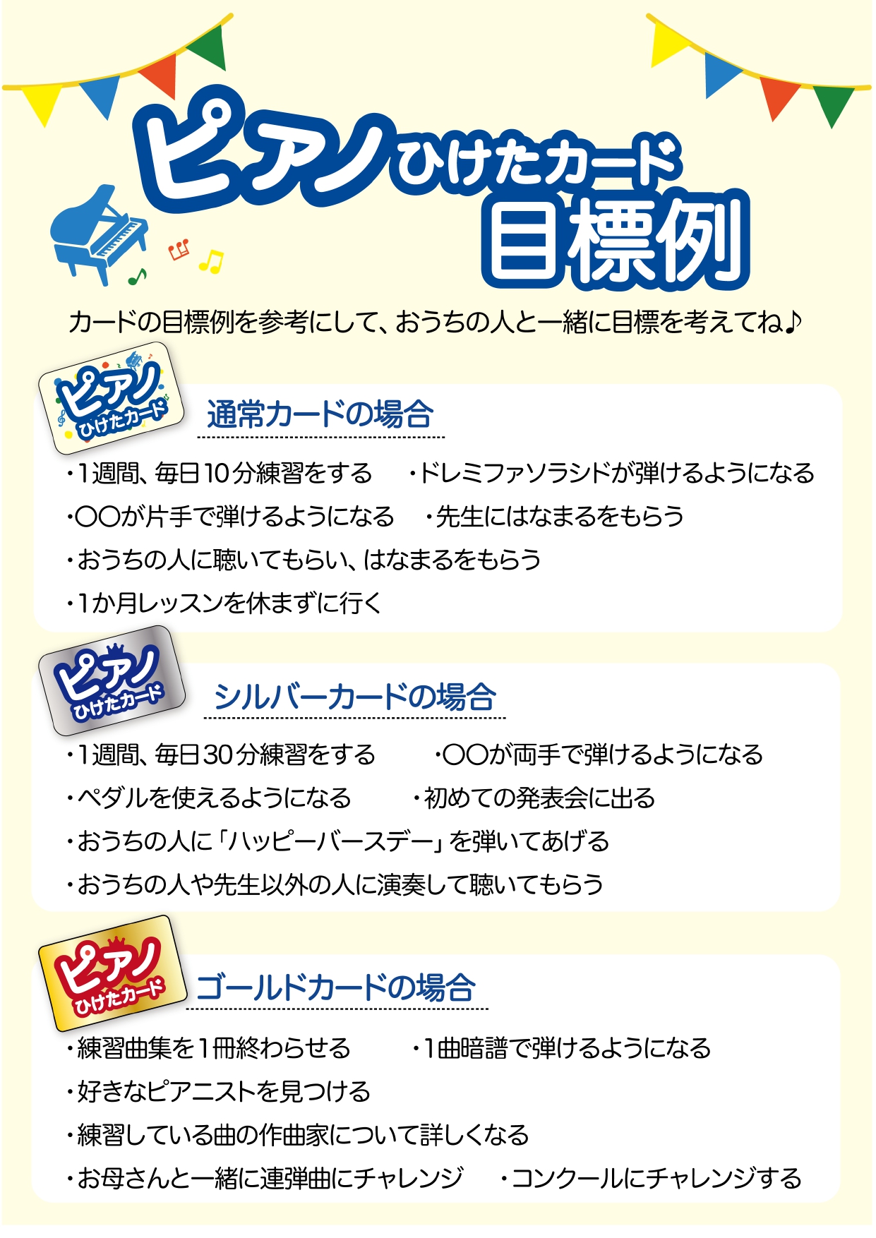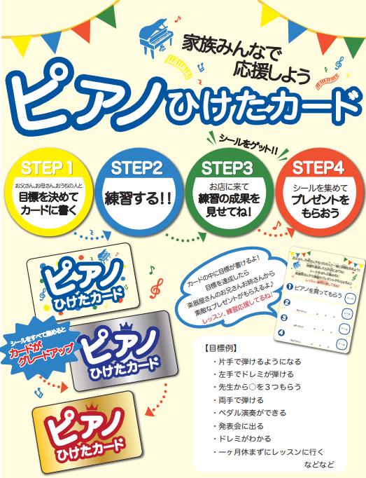 ピアノ購入時に、お子様専用カードとしてお渡し、お子様自身、ご家族様でピアノレッスンの目標を決めて頂きます。