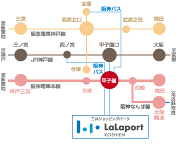 「西宮北口」駅より「今津」駅で阪神電車本線乗り換え、阪神「甲子園」駅へ6分
