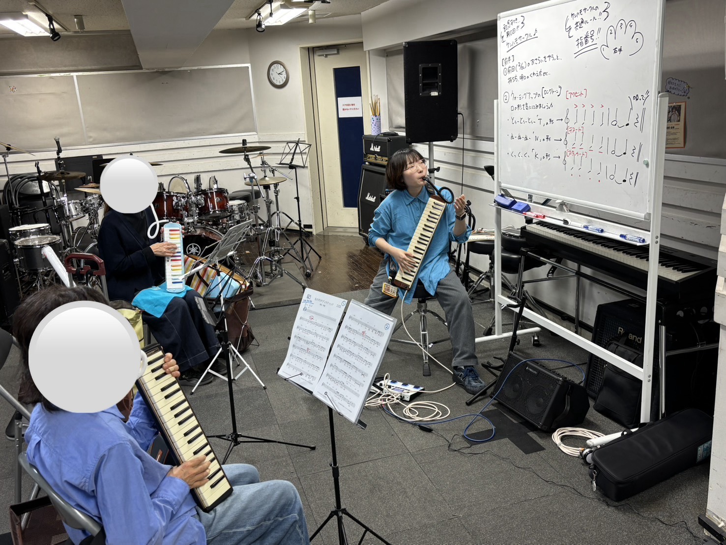 この3つの口の形を、息のスピードや鍵盤ハーモニカの楽器としての特長を利用して演奏した時に落とし込めていけたら…と思い、音楽記号に置き換えたらこの記号が一番近くない?というお話もしました。