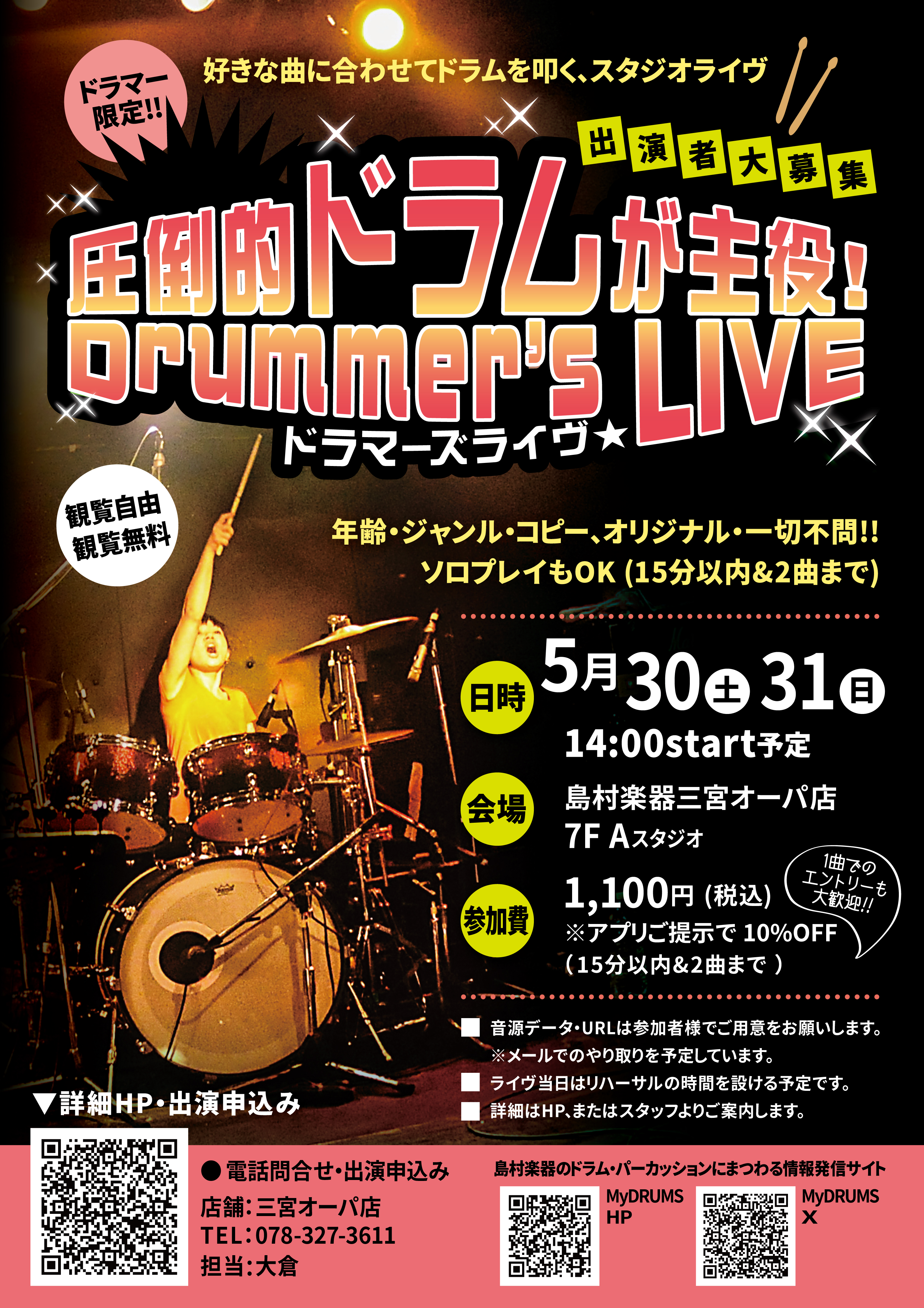 【イベント】島村楽器 三宮オーパ店★2026, 5/30(土), 5/31(日)★圧倒的ドラムが主役!Drummer’s LIVE