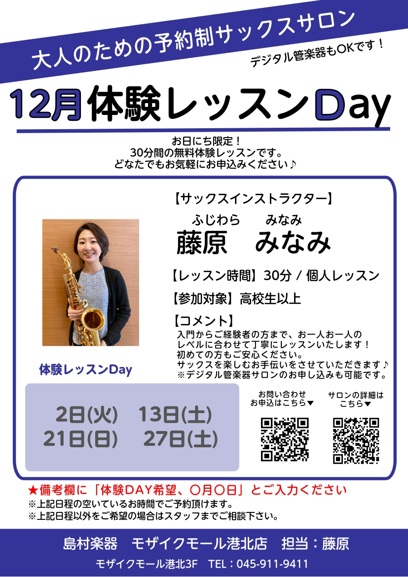 【大人のサックス】12月体験レッスンDAY!デジタル管楽器も大歓迎!