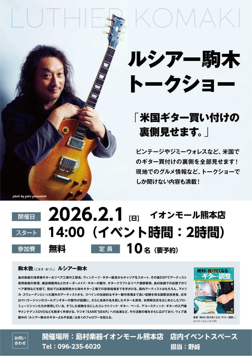 2026/2/1(日)ルシアー駒木による買付ギタートークショウinイオンモール熊本店開催決定!