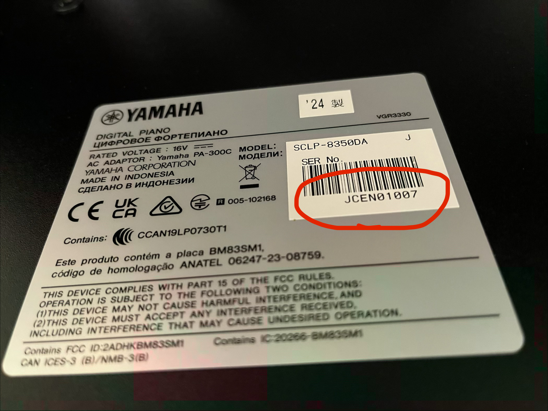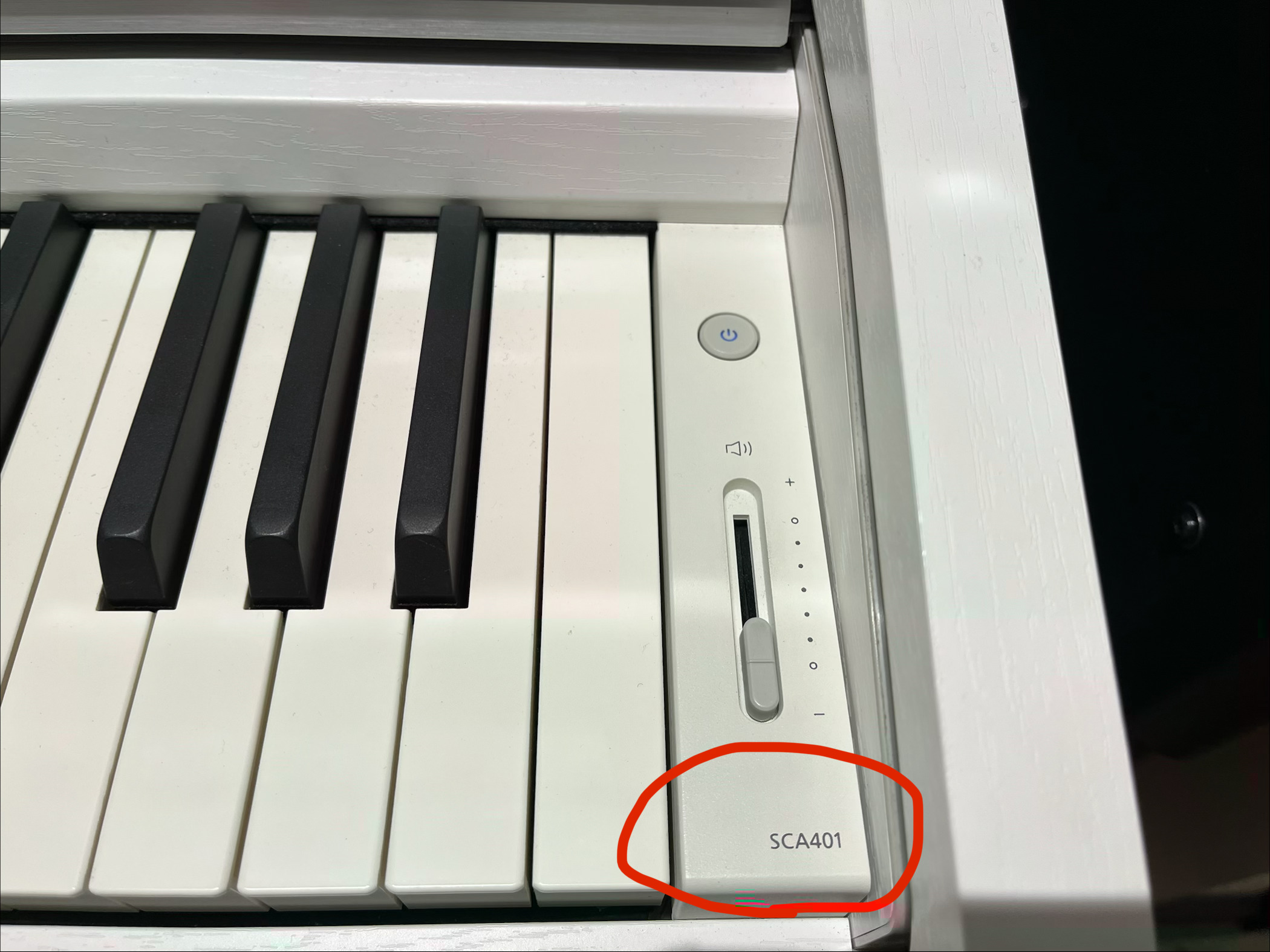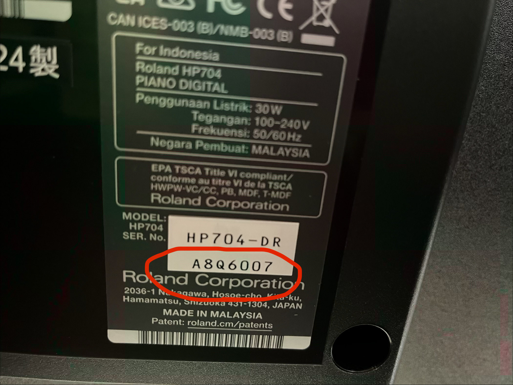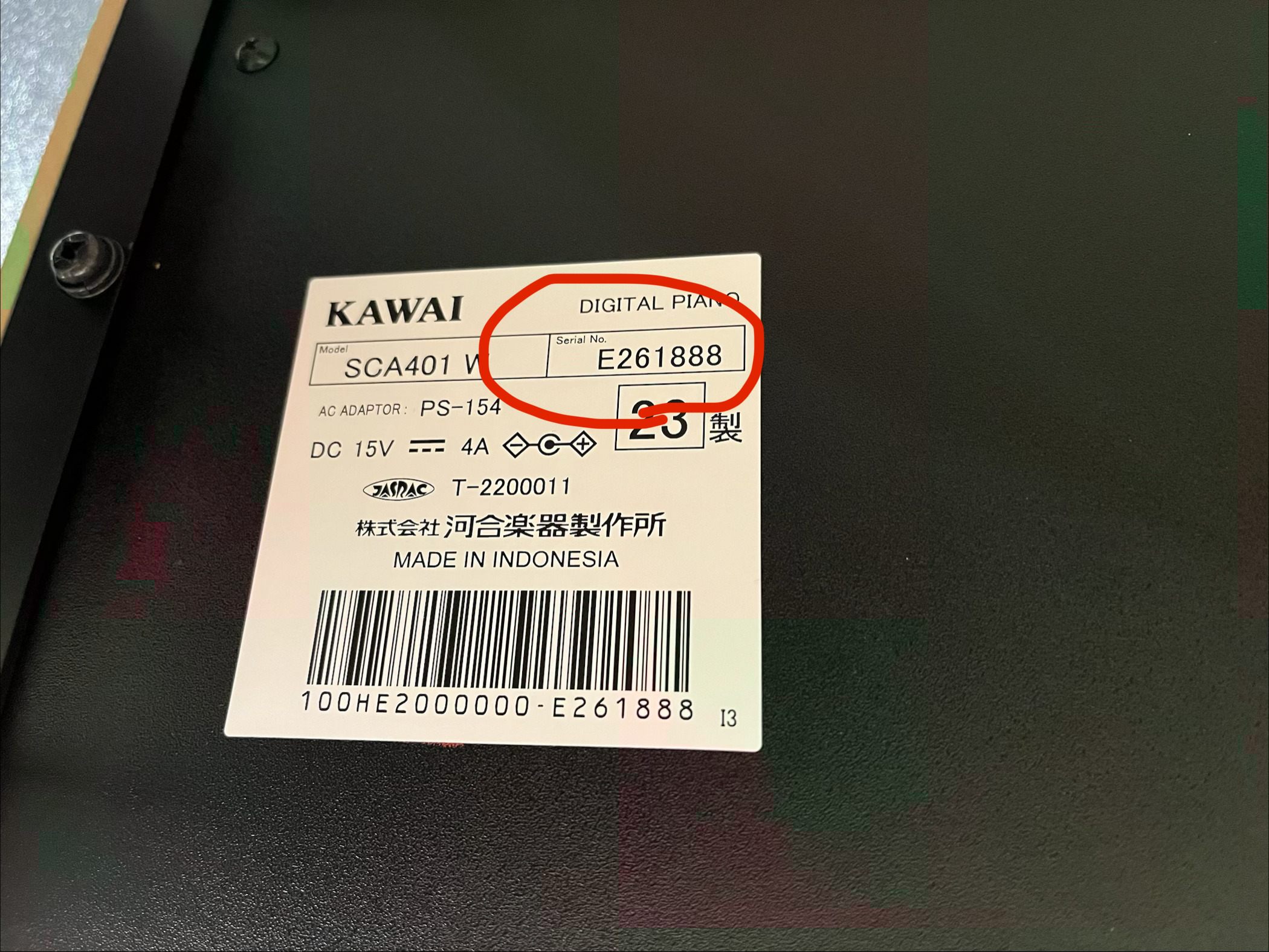 カシオは機種により記載場所が異なりますが、型番・製造番号は上記3メーカー同様に鍵盤の裏にシールが貼ってあることが多いです。