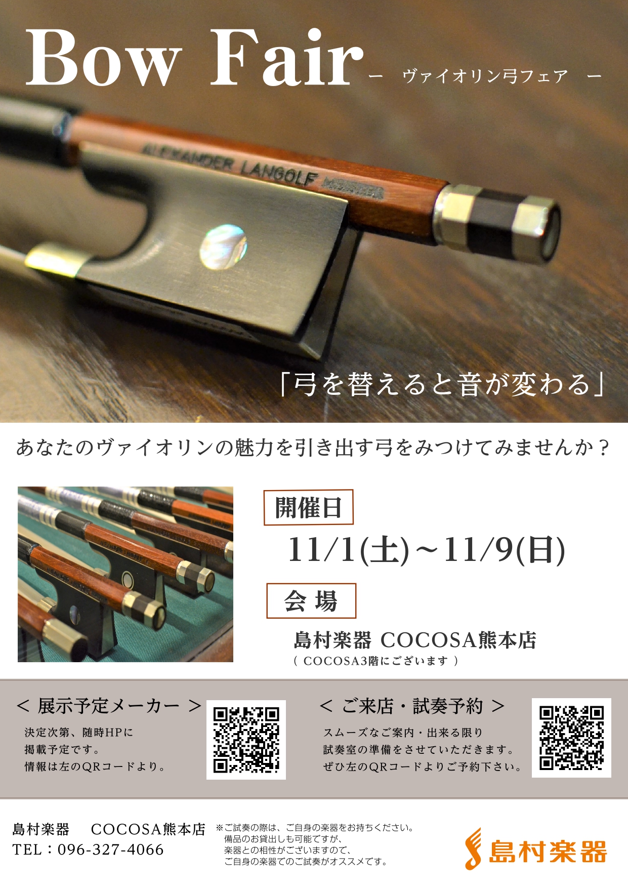 ![CONTENTS弓フェア詳細展示品ラインナップご来場予約当店で弦楽器を選ぶメリット♪お気軽にお問合せください♪弓フェア詳細 >セットヴァイオリンの付属弓を使っている方に弾きやすい弓をご提案します! 本来の弓はフェルナンブーコというブラジル原産の木材で作られていますが、セットヴァイオリンなどに付属で付 […]](https://www.shimamura.co.jp/shop/kumamoto/wp-content/uploads/sites/74/2025/07/20251021-3ff5da77869cc828812411841adeed9d.jpg)