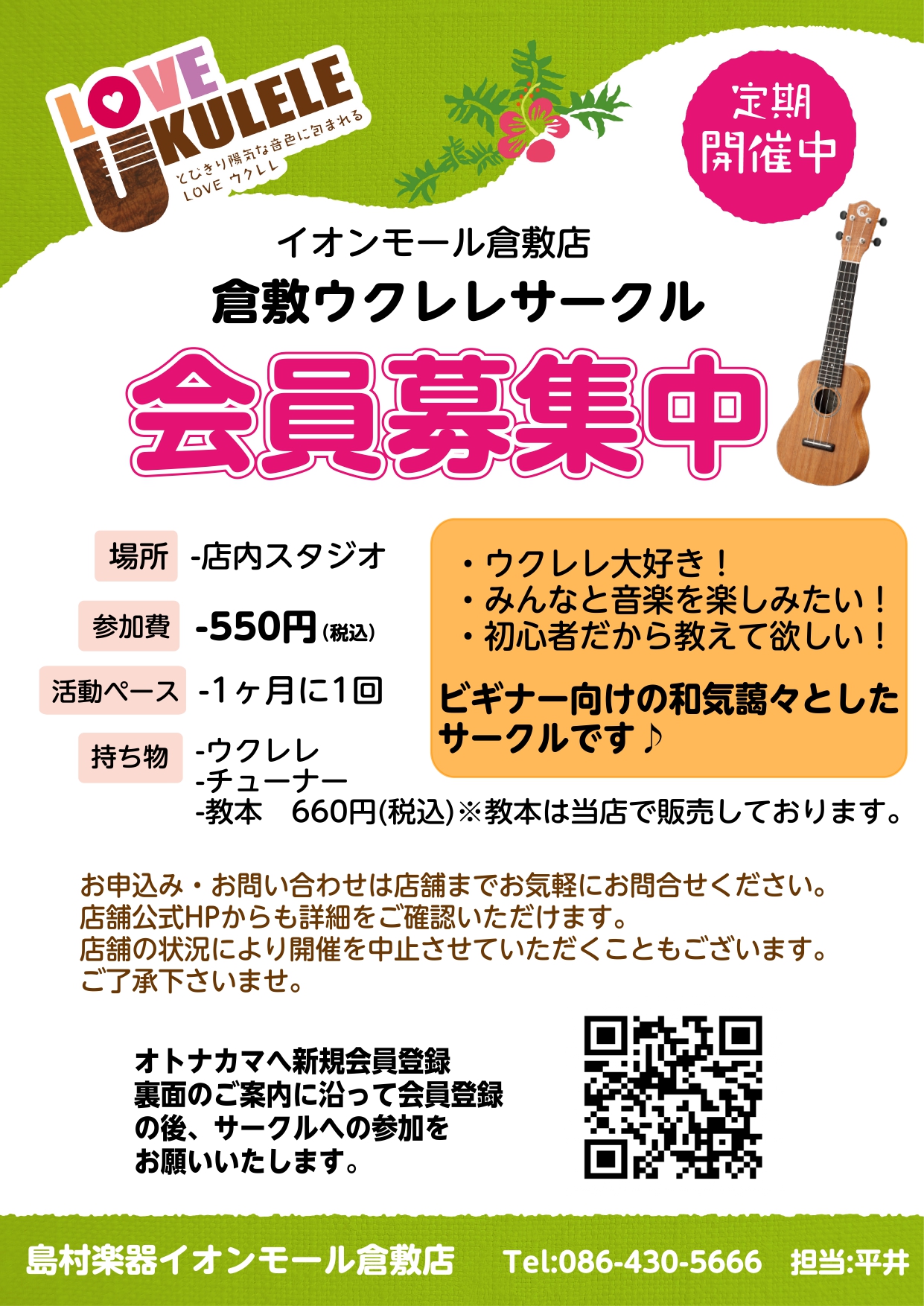 島村楽器イオンモール倉敷店 ウクレレサークル担当の平井(ひらい)です。