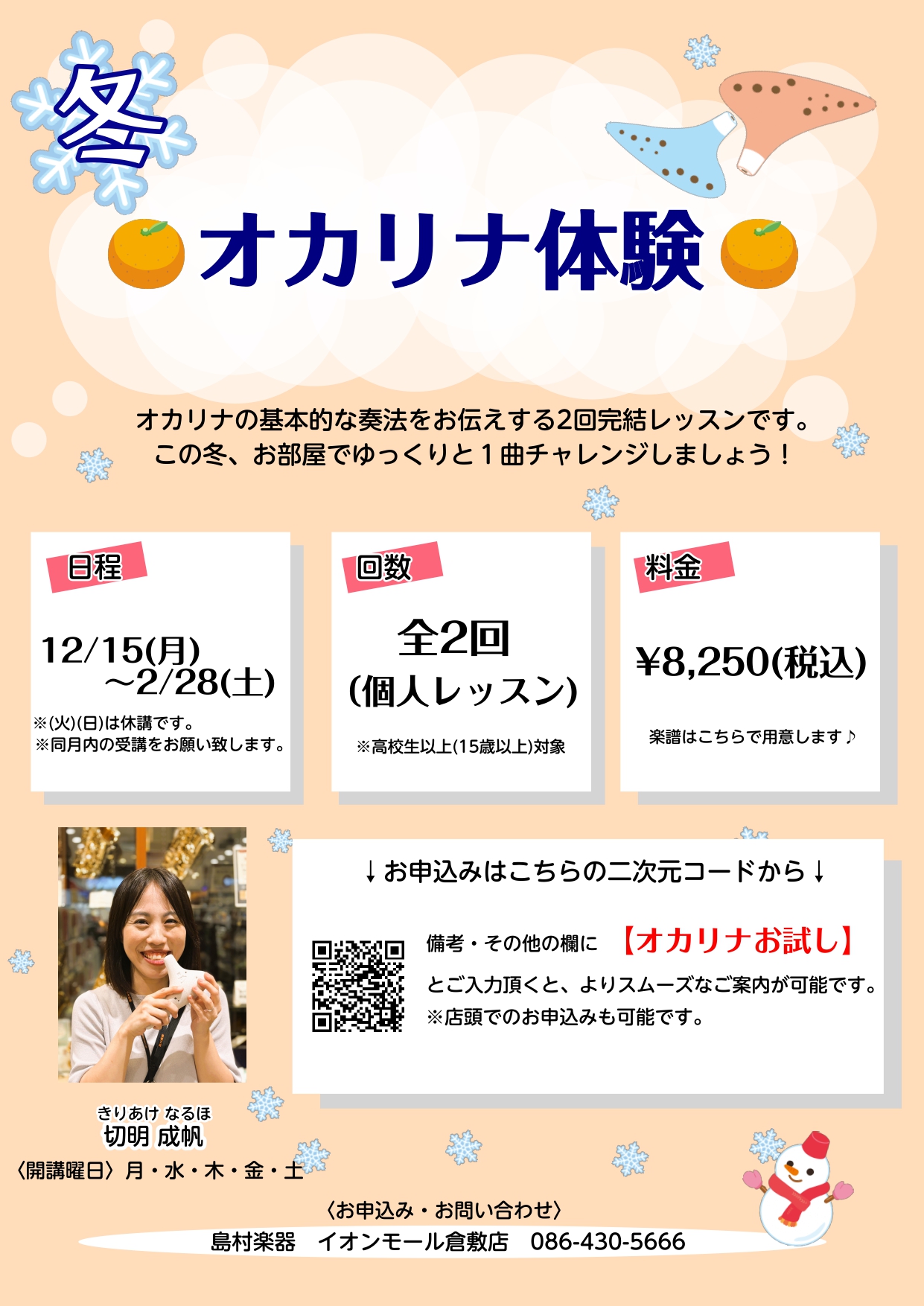 CONTENTS冬のオカリナ体験会 概要インストラクターのご紹介音楽教室担当のご紹介!お問い合わせ冬のオカリナ体験会 概要 インストラクターのご紹介 音楽教室担当のご紹介! お問い合わせ イオンモール倉敷店のスタッフはこんなメンバーです↓↓ 音楽教室総合案内はコチラ↓↓ 体験レッスンスケジュールはコ […]
