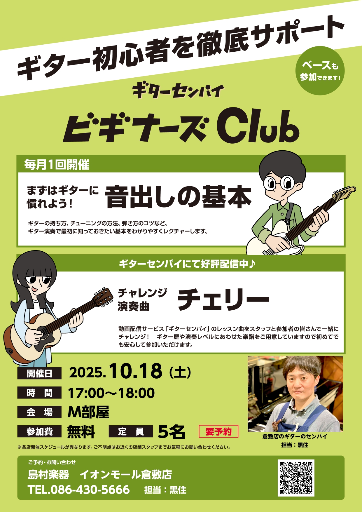 CONTENTS『ビギナーズClub』とは・・・?『ギターセンパイビギナーズClub』開催日程準備物ギターセンパイとは・・・?イオンモール倉敷店のギターセンパイ『ビギナーズClub』とは・・・? ギター(ベース)初心者のみなさんが感じている悩みや疑問を、店舗にて島村楽器スタッフがわかりやすくレクチャ […]