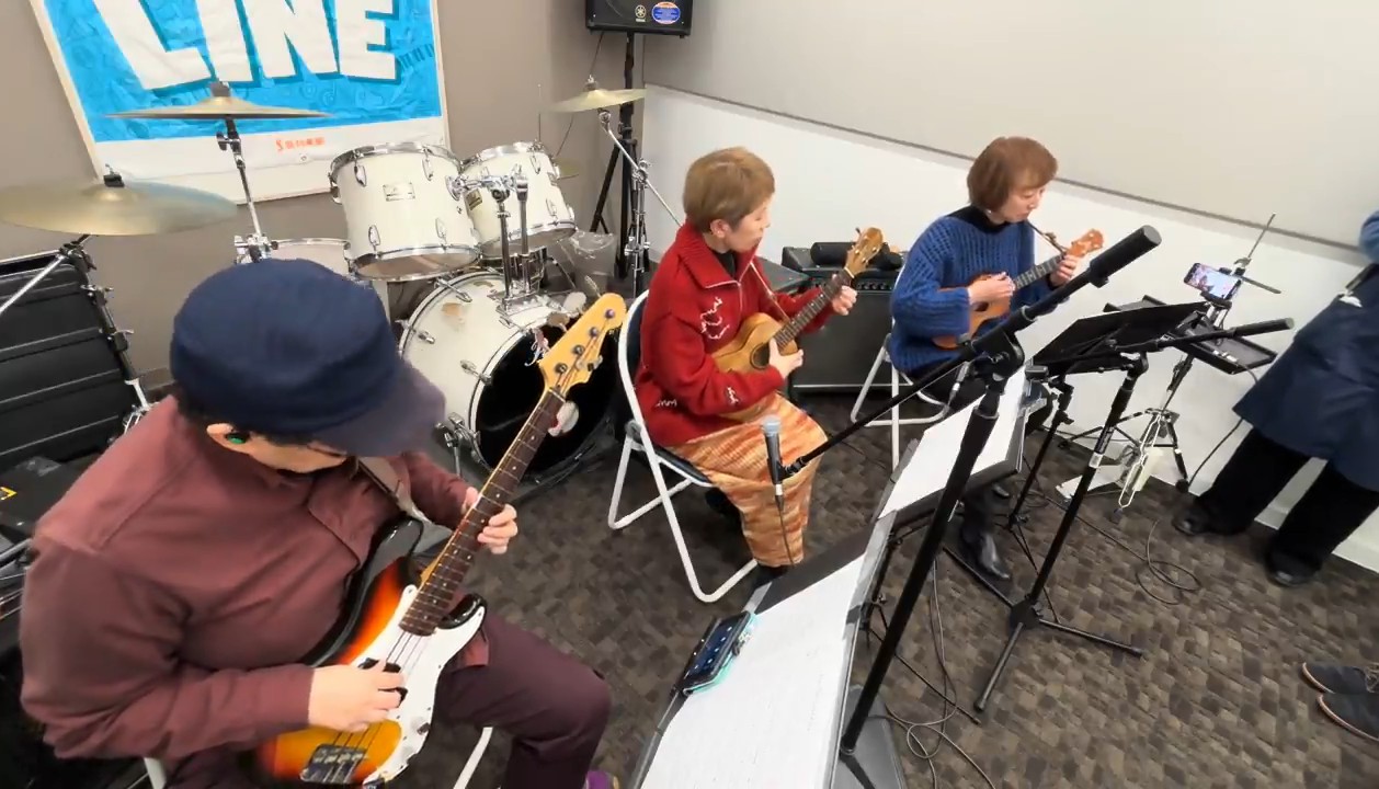 ウクレレはコード演奏とメロディーに分かれており、そのふたりを支えるベースで構成されています。