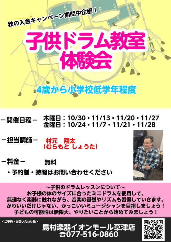 ![CONTENTS「子供ドラム教室」体験会 お申込み受付中!概要講師紹介体験会申込み・お問い合わせ「子供ドラム教室」体験会 お申込み受付中! 初心者の方大歓迎!!!!! 4歳~小学校低学年の方を対象に子供のドラム教室体験会を実施します♪ 「ドラムを習ってみたい」「小さい頃からリズム感をつけさせたい」「 […]](https://www.shimamura.co.jp/shop/kusatsu/wp-content/uploads/sites/130/2024/03/20251109-986edfd8c76cc50a93fbfaf86a8064b7.png)