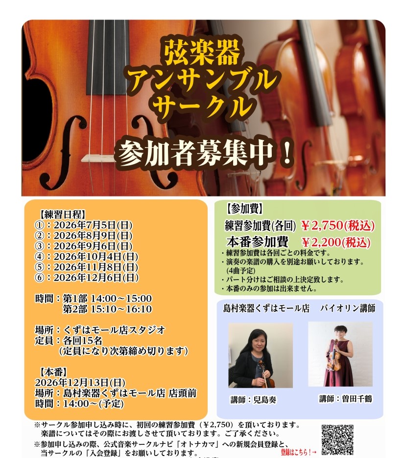 初心者、経験者どなたでもOK!一緒にアンサンブルがしたい!という方を募集いたします! 当サークルの概要、参加登録についてはこちらのページへ↓↓↓ 2026年4月中旬頃よりお申込み開始予定です!! お申込み開始は4月中旬頃を予定しております。店頭での受付となります! お申込みが開始しましたらホームペー […]