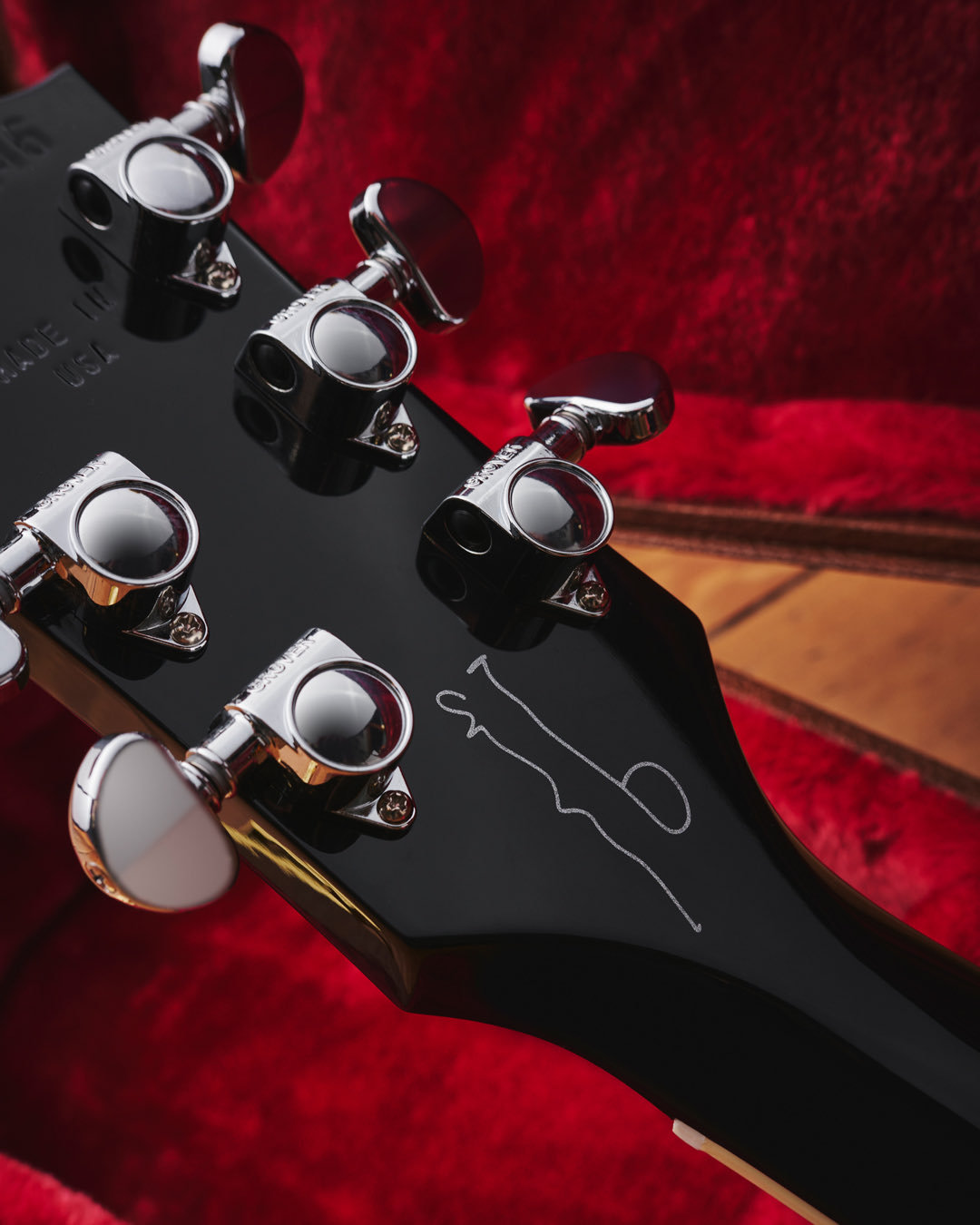 エレクトロニクスも特徴的で、クロームカバーを施した独自のギブソンP-90ソープバー・ピックアップは個別にボリューム/トーンコントロールへハンドワイヤリングされ、3ウェイピックアップ・セレクターを備えています。コントロール・ノブはシルバー・リフレクターとダイヤル・ポインター付きのブラック・トップハットを使用しています。ヘッドストック裏面にアーティストのサインを再現したデカールが施され、ハードシェルケースが付属しており、あらゆる場面で安全に持ち運べます。