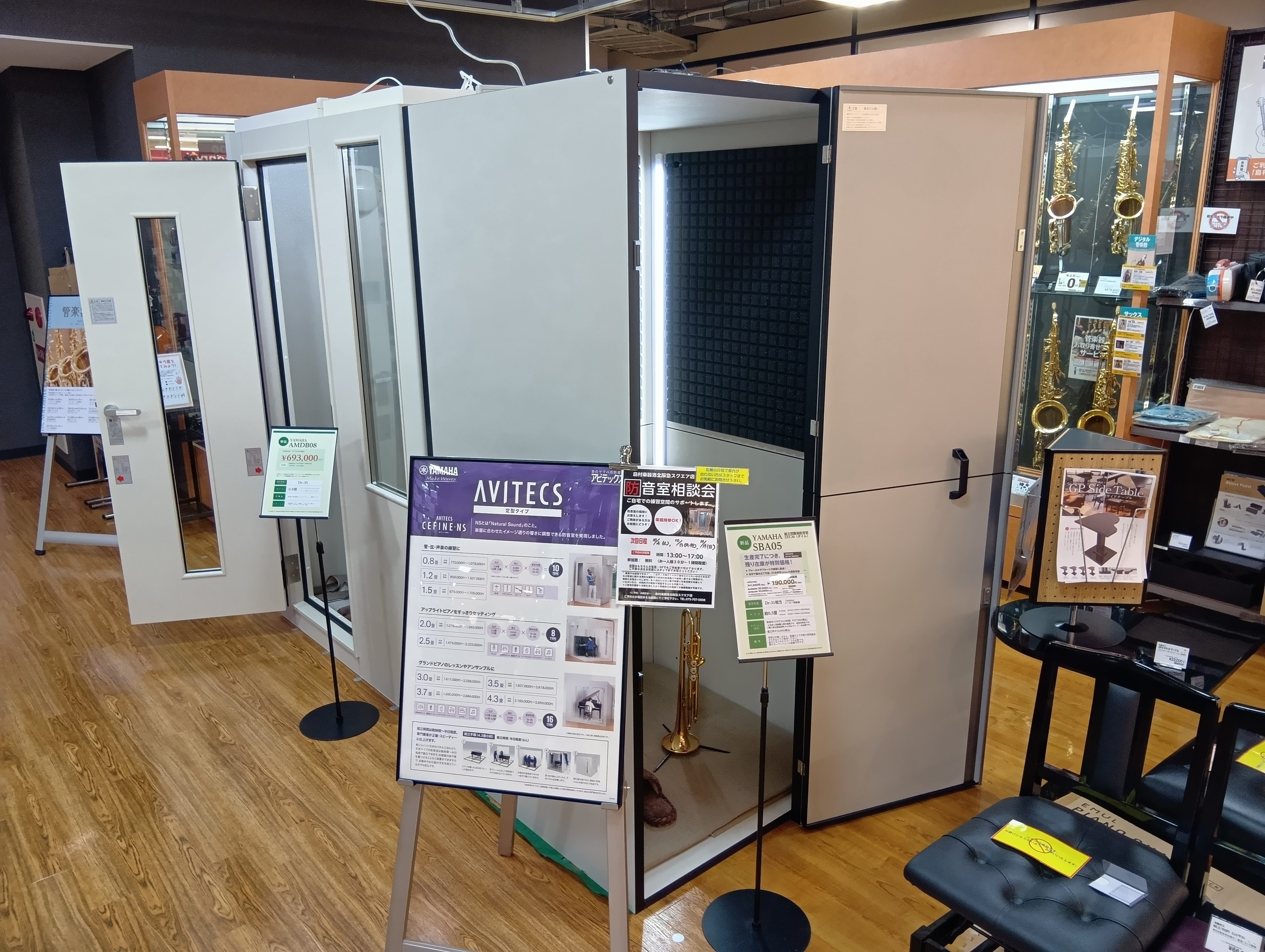 お客様ご自身でも組み立て頂ける簡易防音室ヤマハDIY.M(ダイム)やセフィーネNSが新たに入荷。実際のサイズを見て頂くことができるのはもちろん室内に入ってみたり、外から防音性能を確認することができます。