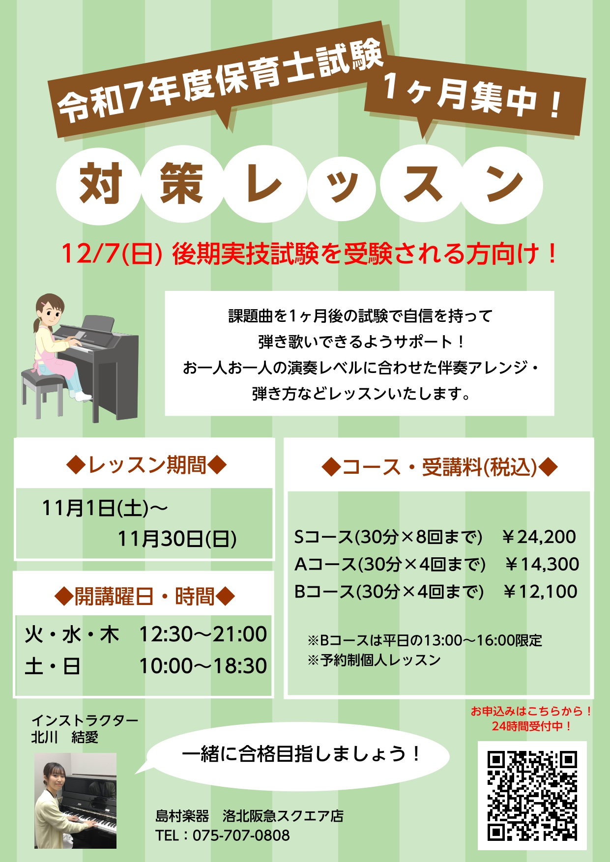 ![こんにちは!島村楽器洛北阪急スクエア店 ピアノインストラクターの北川です。 島村楽器洛北阪急スクエア店 保育士ピアノサロンでは、保育士試験対策レッスンも行っております。 試験対策が不安な方、お一人お一人に合ったカリキュラムで全力でサポートしますのでお気軽にお問合せください! CONTENTS令和7年 […]](https://www.shimamura.co.jp/shop/kyoto/wp-content/uploads/sites/57/2025/01/20250114-order_shima250114-0190_order_pdf_page-0001.jpg)