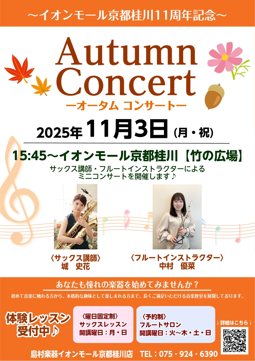 ![サックス講師、フルートインストラクターによるミニコンサートを開催いたします!たくさんの方々のご来場・ご観覧をお待ちしております♪ CONTENTS概要サックス講師フルートインストラクター【ご来場者限定】期間中に体験レッスンお申し込みでノベルティプレゼント!スクール・サロンの違いお問い合わせ概要 サッ […]](https://www.shimamura.co.jp/shop/kyotokatsuragawa/wp-content/uploads/sites/164/2025/10/20251004-shima251004-0123_cropped_page-0001.jpg)