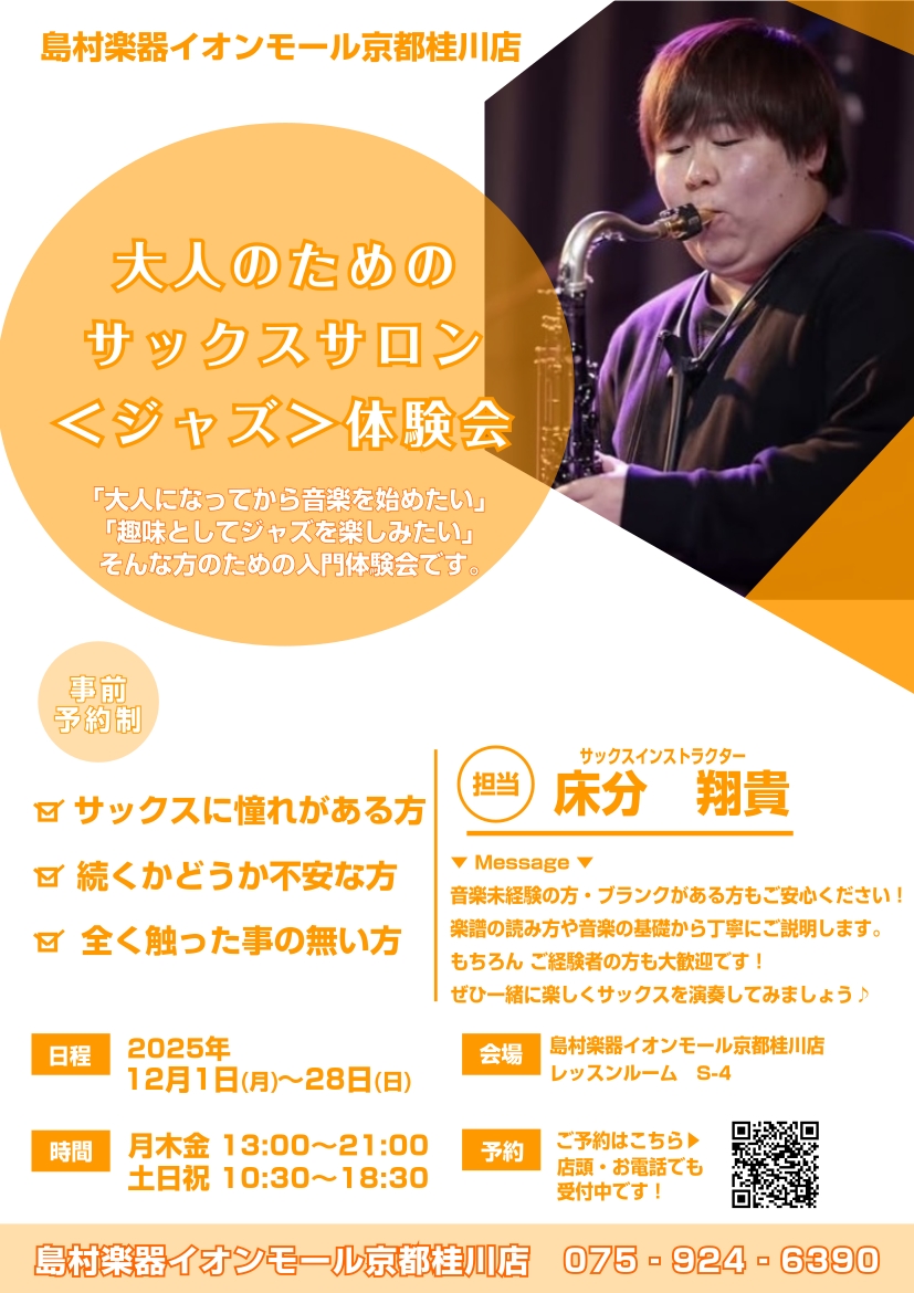 ![CONTENTS◆ 体験会のご案内◆ おすすめポイント◆ インストラクター紹介◆ お申込み方法よくあるご質問アクセス情報◆ 体験会のご案内 サックスでジャズに挑戦してみませんか?「大人になってから音楽を始めたい」「趣味としてジャズを楽しみたい」そんな方のための入門体験会です。 内容サックスの基本の吹 […]](https://www.shimamura.co.jp/shop/kyotokatsuragawa/wp-content/uploads/sites/164/2025/09/20251012-tokobana.jpg)