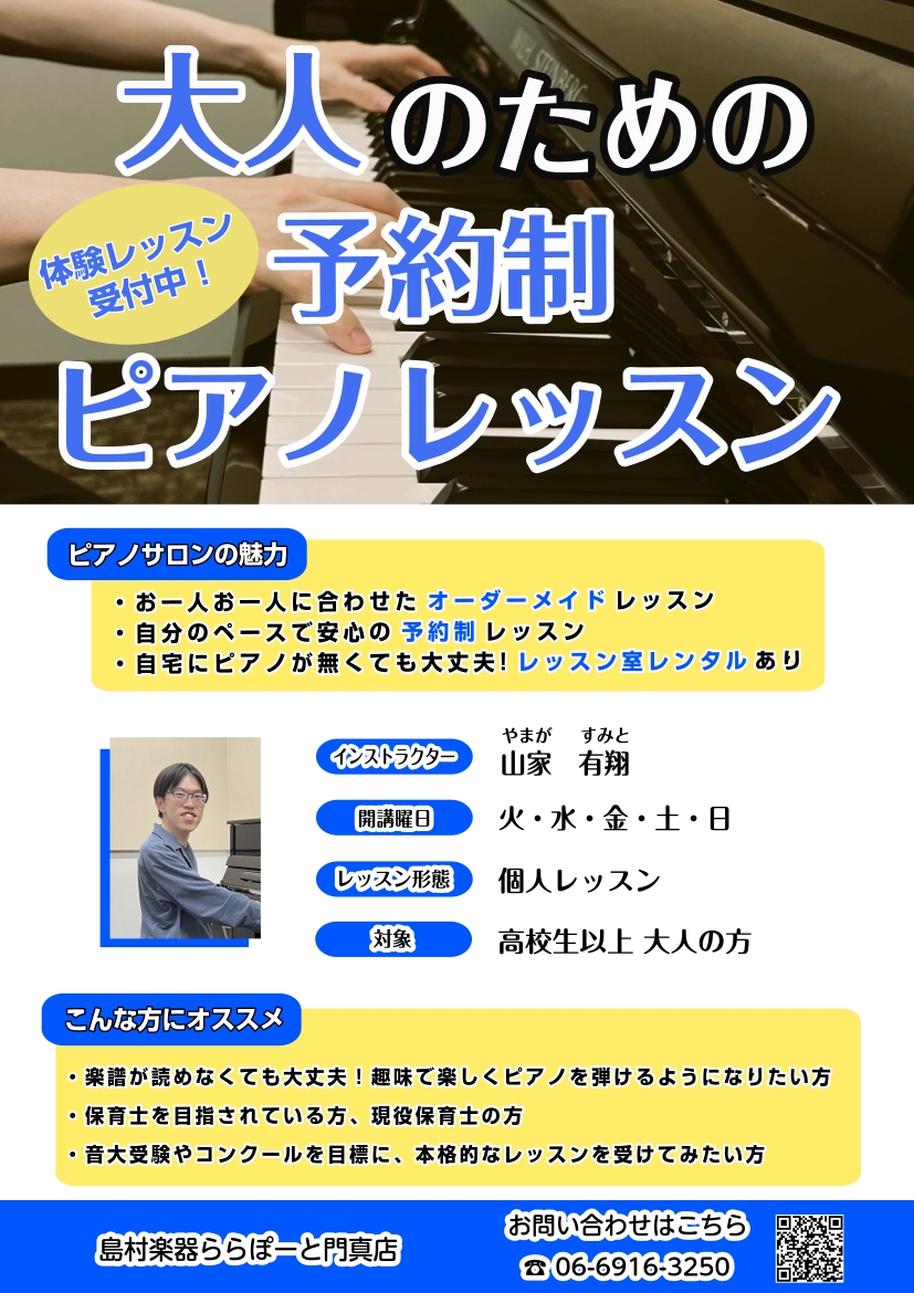 ![CONTENTSこんなお悩みを持つあなたへインストラクター山家はこんな先生!レッスンシステムのご案内お問い合わせはこちらこんなお悩みを持つあなたへ ・ピアノに憧れはあるけど何から始めたら良いか分からない!・左右の指ってどうやったら別々に動かせるの?・一人で練習していてもすぐに飽きてしまう・レッスンに […]](https://www.shimamura.co.jp/shop/l-kadoma/wp-content/uploads/sites/211/2025/10/20251022-295dfd229ac9e79e6fdaac0c8ac7a84c.jpg)