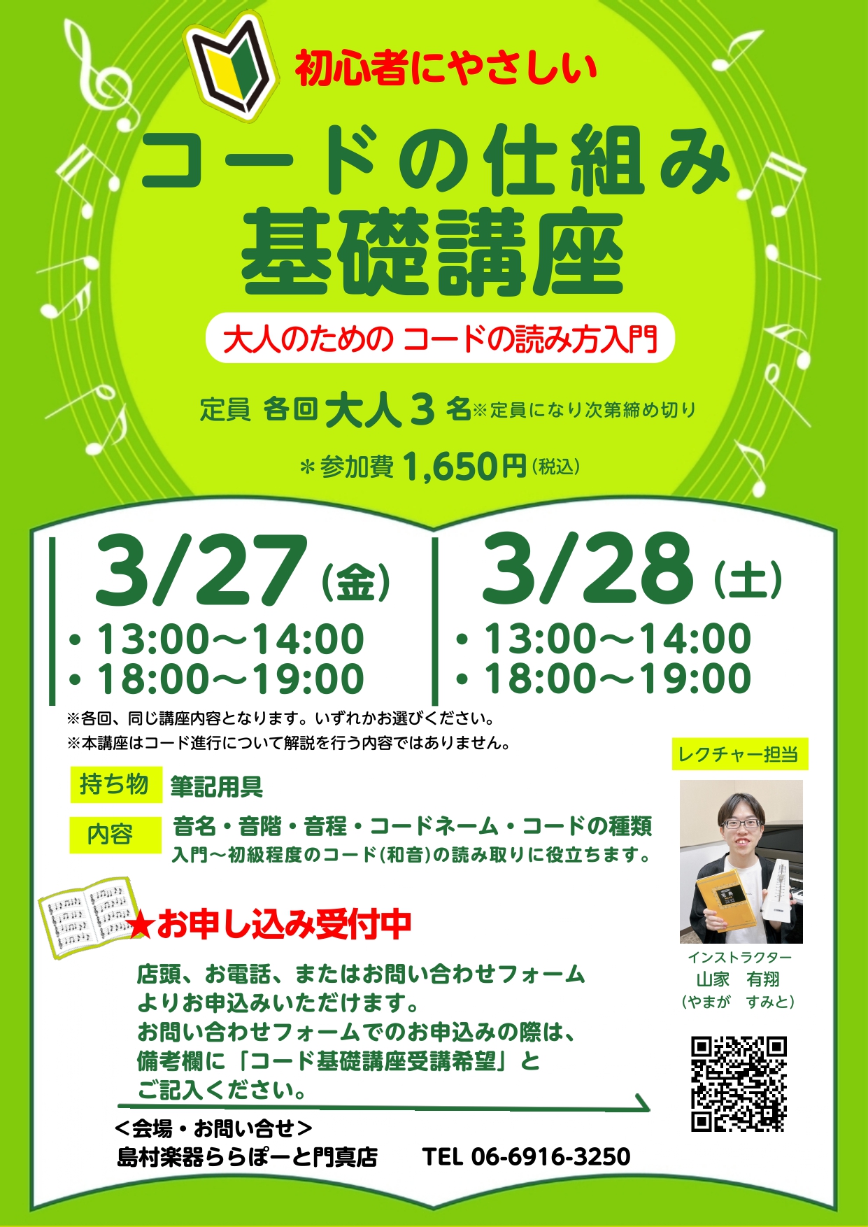 こんにちは!島村楽器ららぽーと門真店、ピアノインストラクターの山家です。 ・楽器を始めたけど、コードが何かわからない!・ピアノ、キーボードで左手の伴奏はどんな感じにつけたらいいの?・コード譜を読めるようになって、いろんな曲に挑戦したい! そんな方におすすめの単発講座をご案内します。 音符の読み方や音 […]