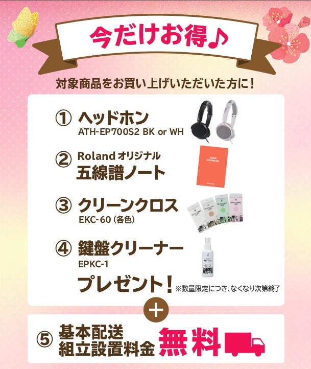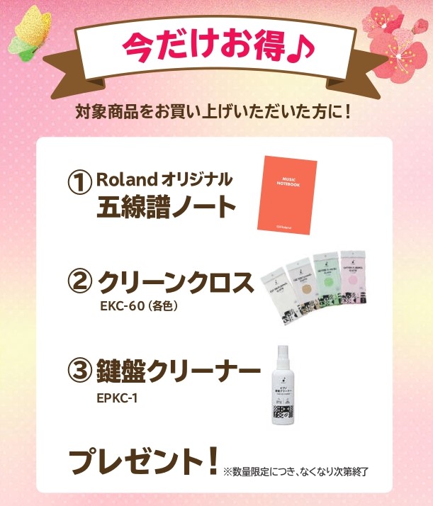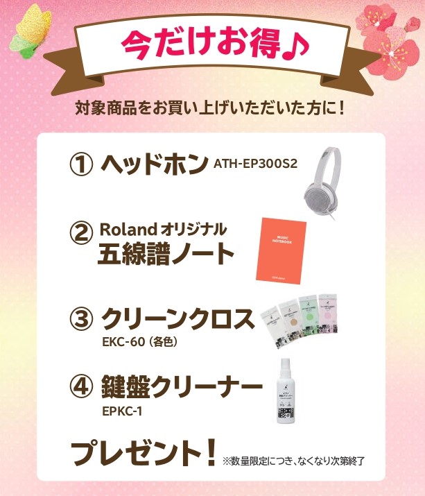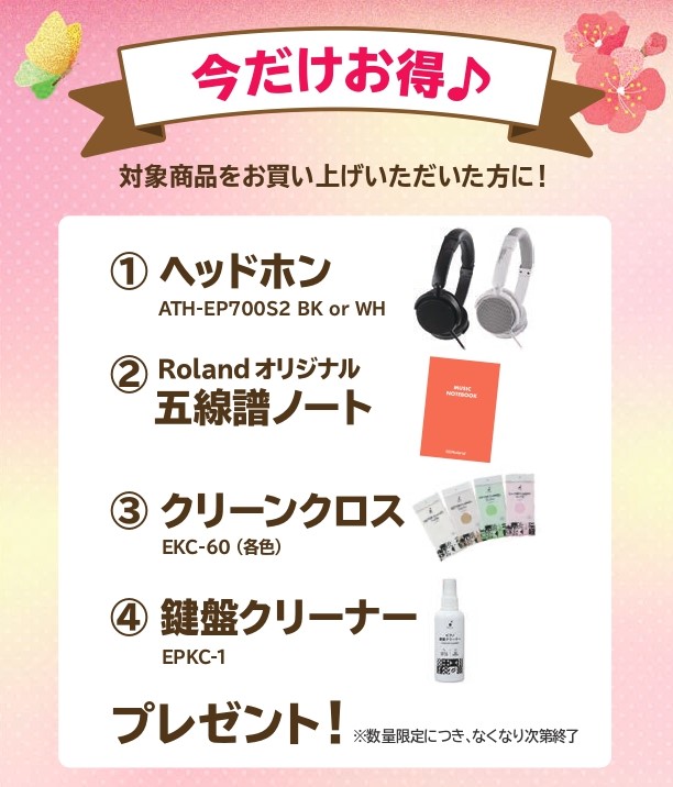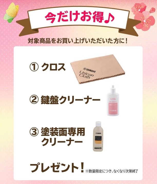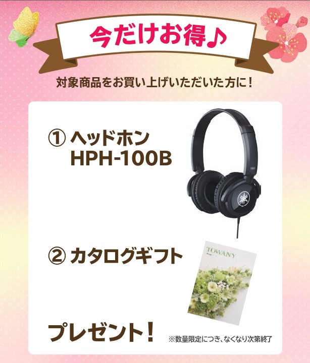 島村楽器ららぽーと堺店では、1/17(土)~2/23(月・祝)の期間中、対象商品ご成約で期間限定特典を進呈しております!