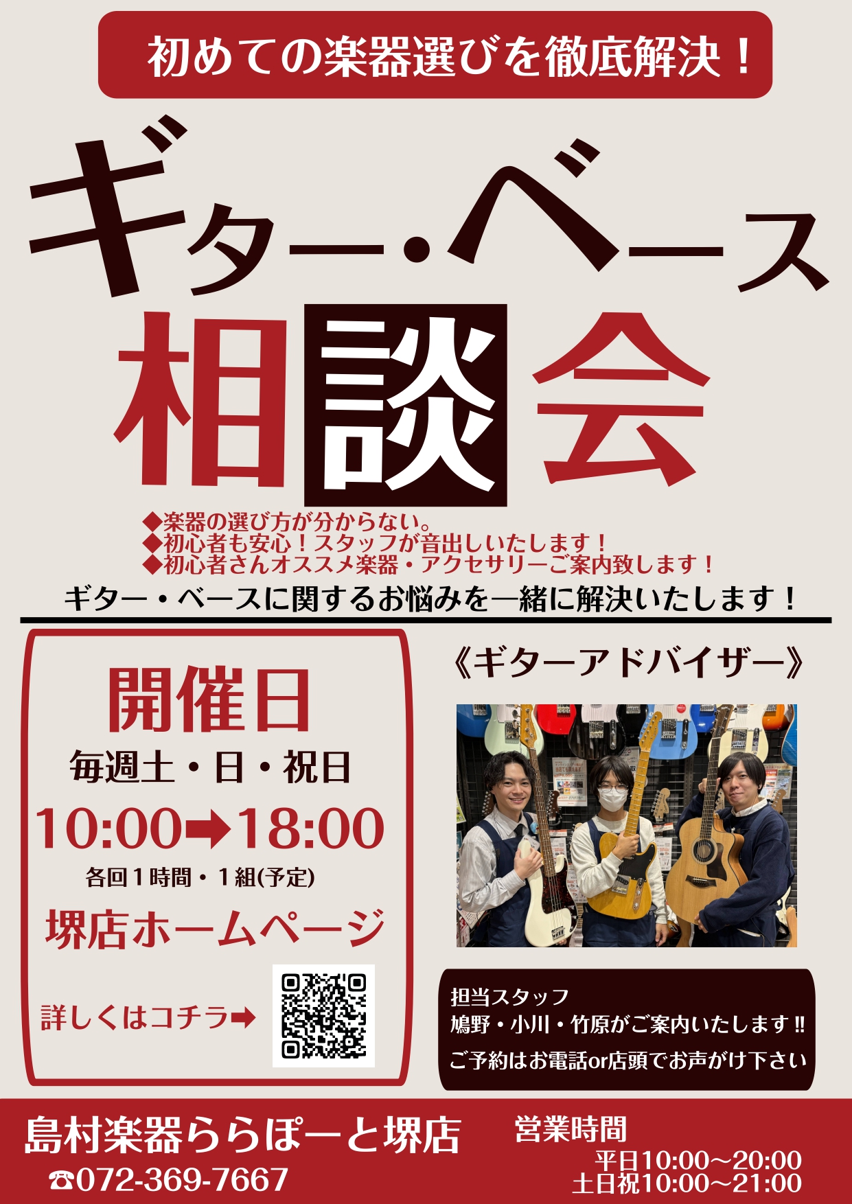 ![最近、SNSをきっかけにギターに挑戦したくなったかた、軽音楽部に入部するため楽器のご購入を考えられている方が多いように感じます。 「形」「メーカー」「性能」沢山の種類がありどれを選んだらいいか分かりませんよね。ギター・ベース選びに悩まれている方向けに当店(社内資格:ギターアドバイザー)による相談会を […]](https://www.shimamura.co.jp/shop/l-sakai/wp-content/uploads/sites/208/2025/04/20250404-20250404-order_shima250404-0191_order_pdf_page-0001.jpg)