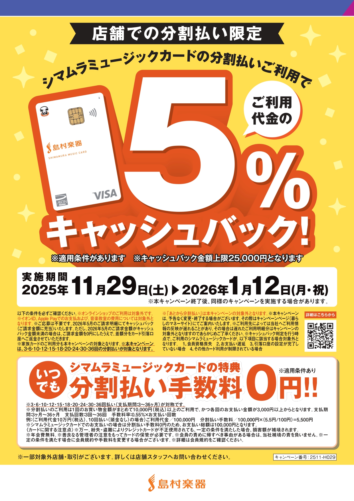 【シマムラミュージックカード】分割払いで5%キャッシュバックキャンペーン実施中!★11/29(土)~1/12(月・祝)