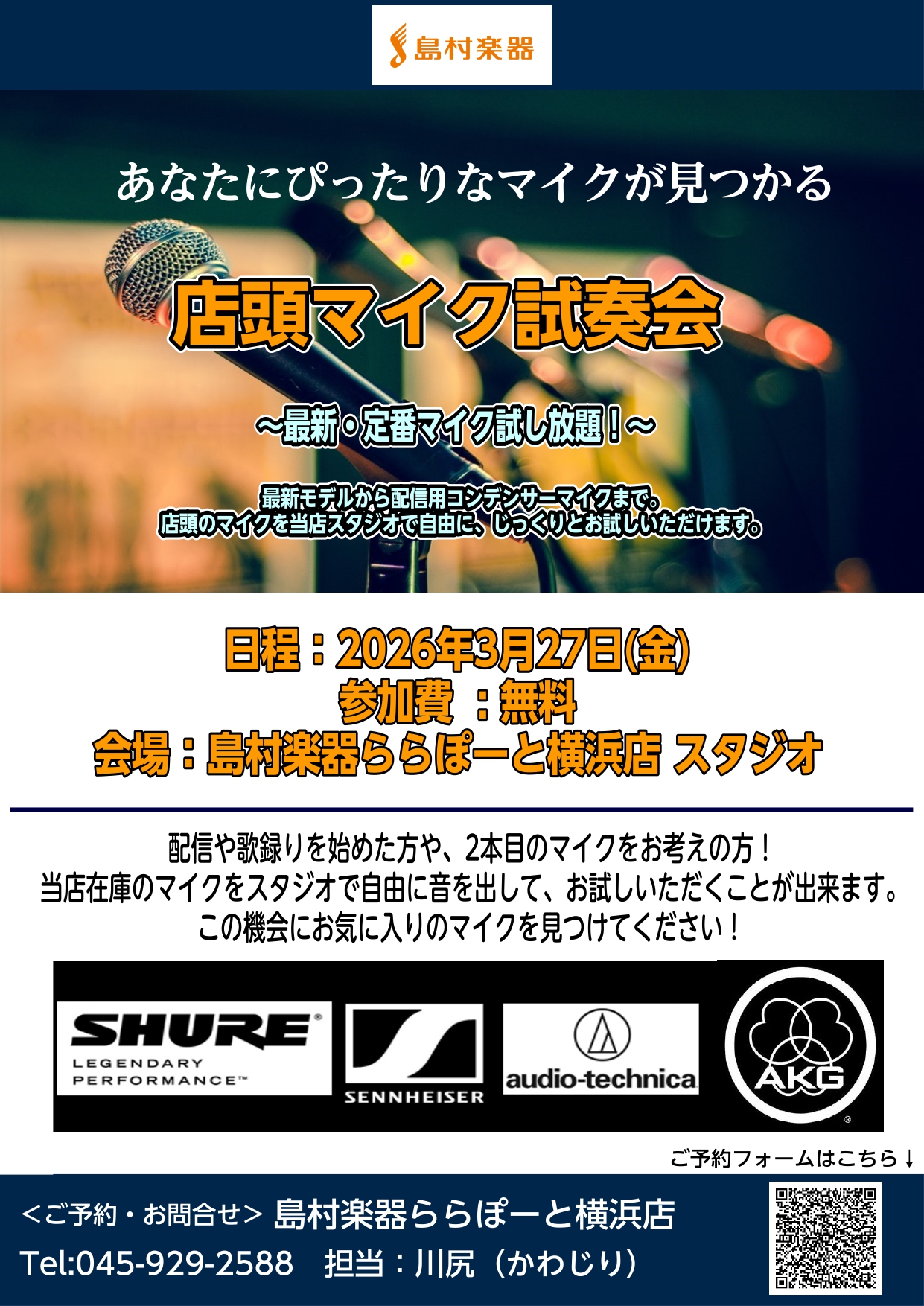![CONTENTSマイクのお試し・ご相談はららぽーと横浜店へ!毎月開催!店頭マイク試奏会私がご案内します!担当スタッフをご紹介当店在庫品の一部をご紹介マイクのお試し・ご相談はららぽーと横浜店へ! ららぽーと横浜店では、人気モデルや話題の新商品をはじめ、ダイナミックマイク、コンデンサーマイクを各種価格帯 […]](https://www.shimamura.co.jp/shop/l-yokohama/wp-content/uploads/sites/111/2025/03/20250331-order_shima250331-0173_order_pdf_page-0001-1.jpg)
