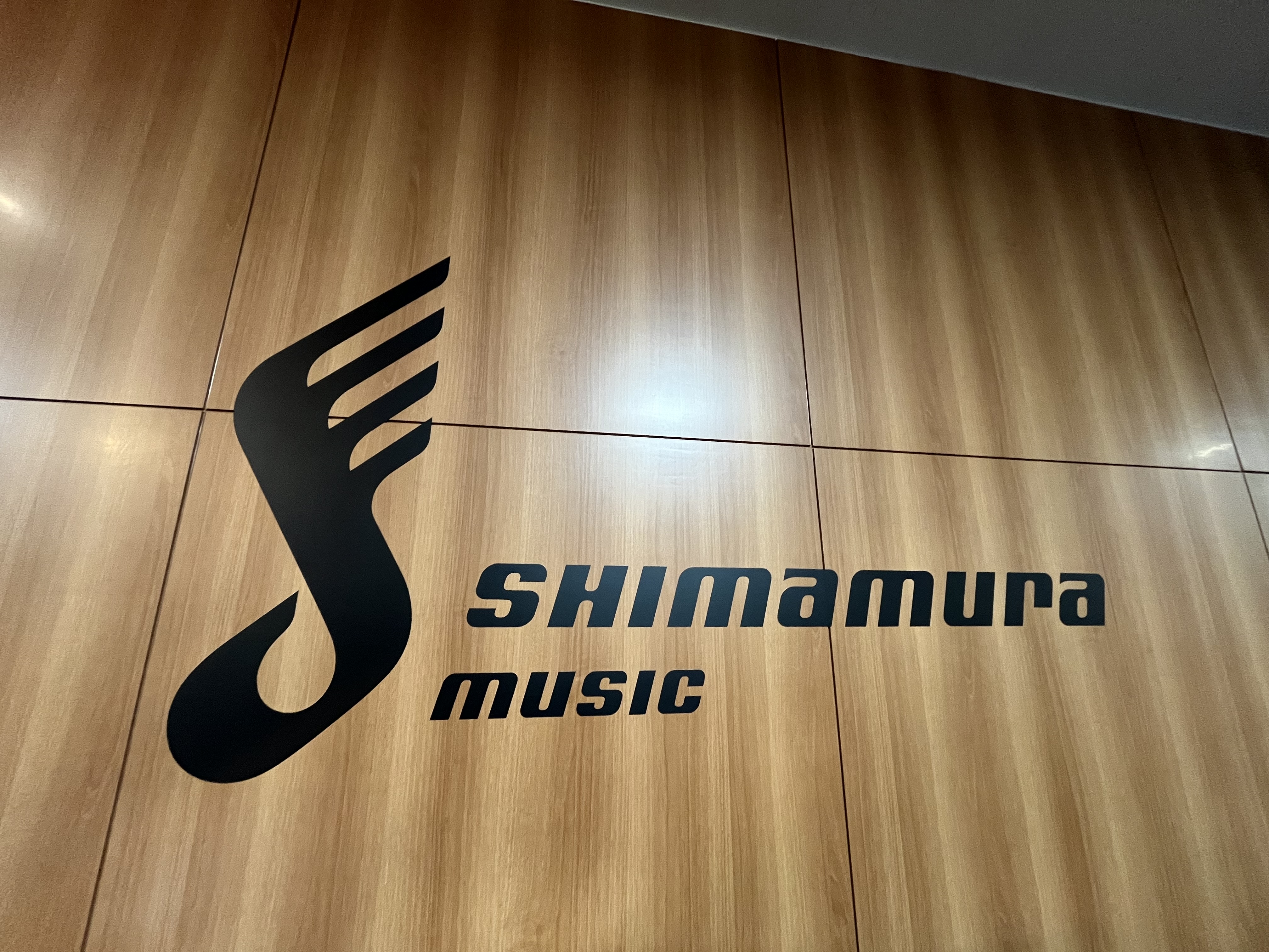 木目模様の素敵な壁へ島村楽器のロゴが!