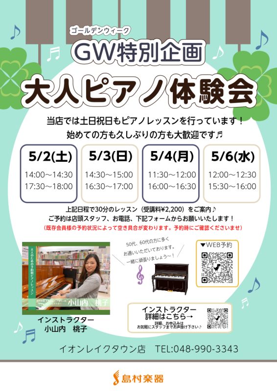 🍀「いつか弾けたらいいな」を、この連休で現実にしてみませんか? 皆様こんにちは!島村楽器 レイクタウン店 ピアノインストラクターの小山内(おさない)です。今年のゴールデンウィーク、何か新しいことを始めたいと考えている方にぴったりのイベントをご用意しました。 「昔からピアノに憧れていた」「定年後の趣味 […]