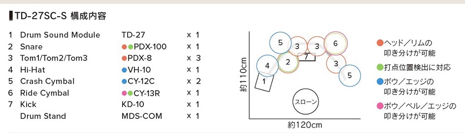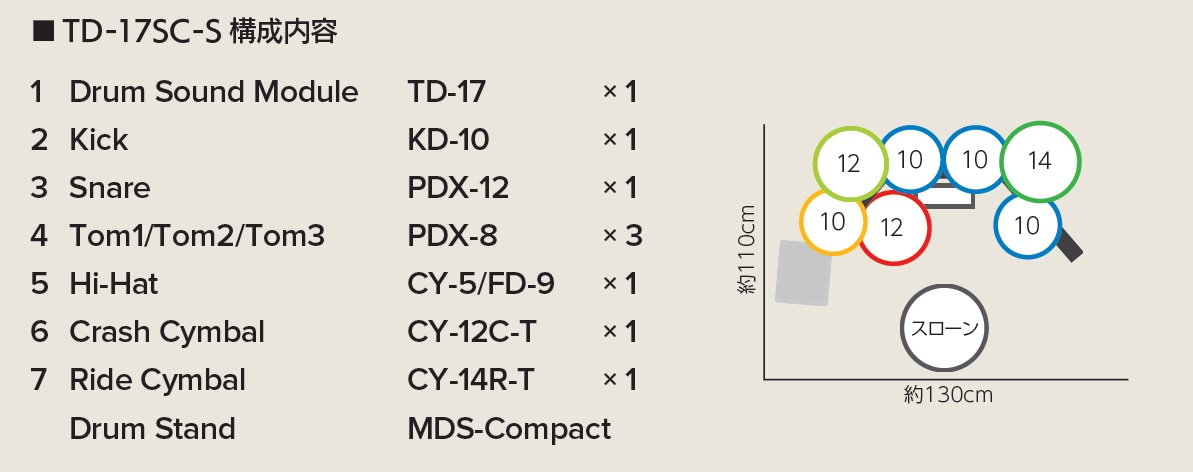 ⑤パッド構成(新仕様)TD-17SC-Sで好評だった 12インチ・スネア は継続搭載。さらに、タム1/タム2=8インチ、フロアタム=10インチ の設計となり、より自然な叩き心地を実現しながらも、コンパクトなままです。