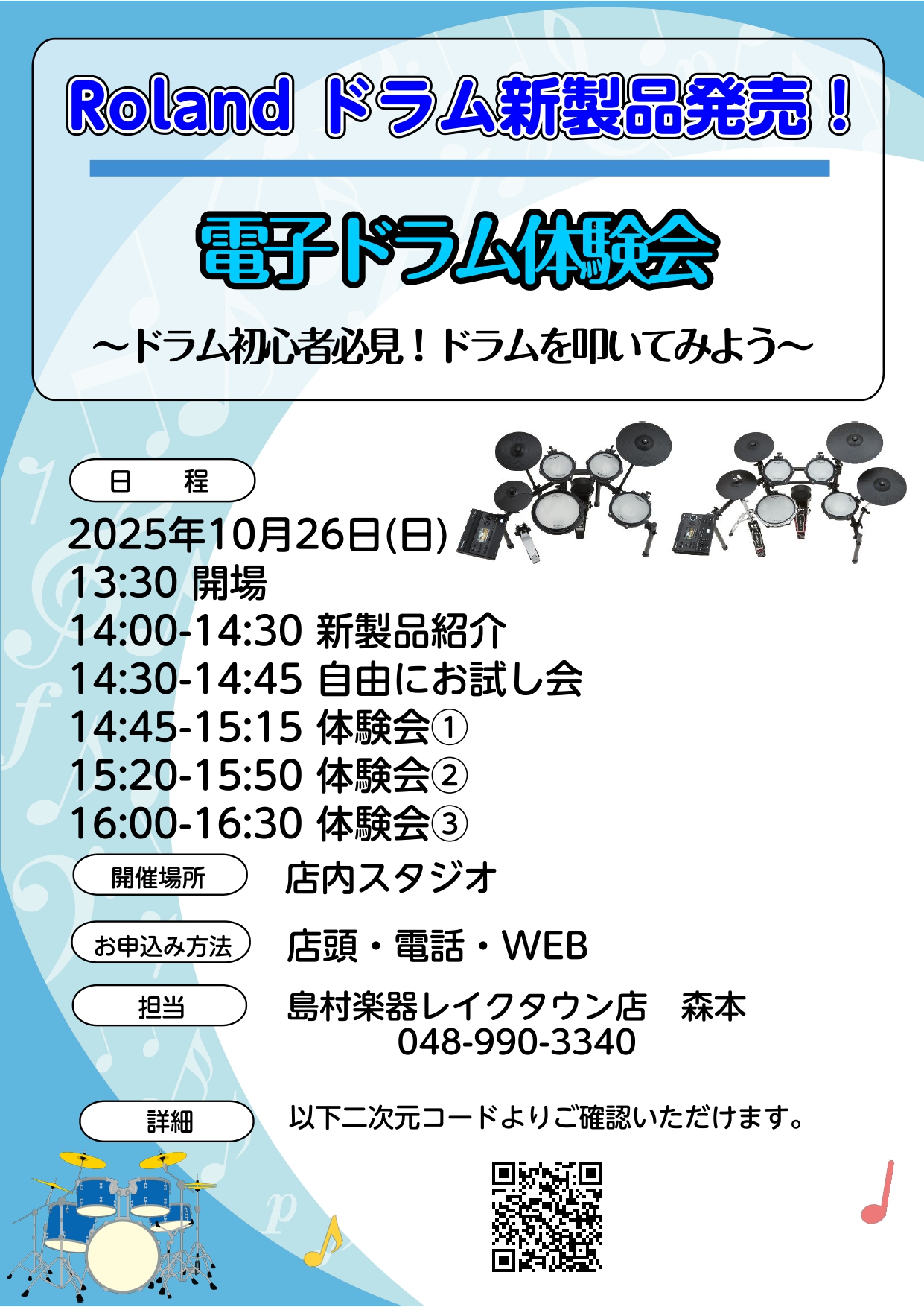 発売を記念して、島村楽器レイクタウン店では上位機種TD713SC-Sと新製品TD313SC-SとTD513SC-Sを使ったドラム体験イベントを開催します!