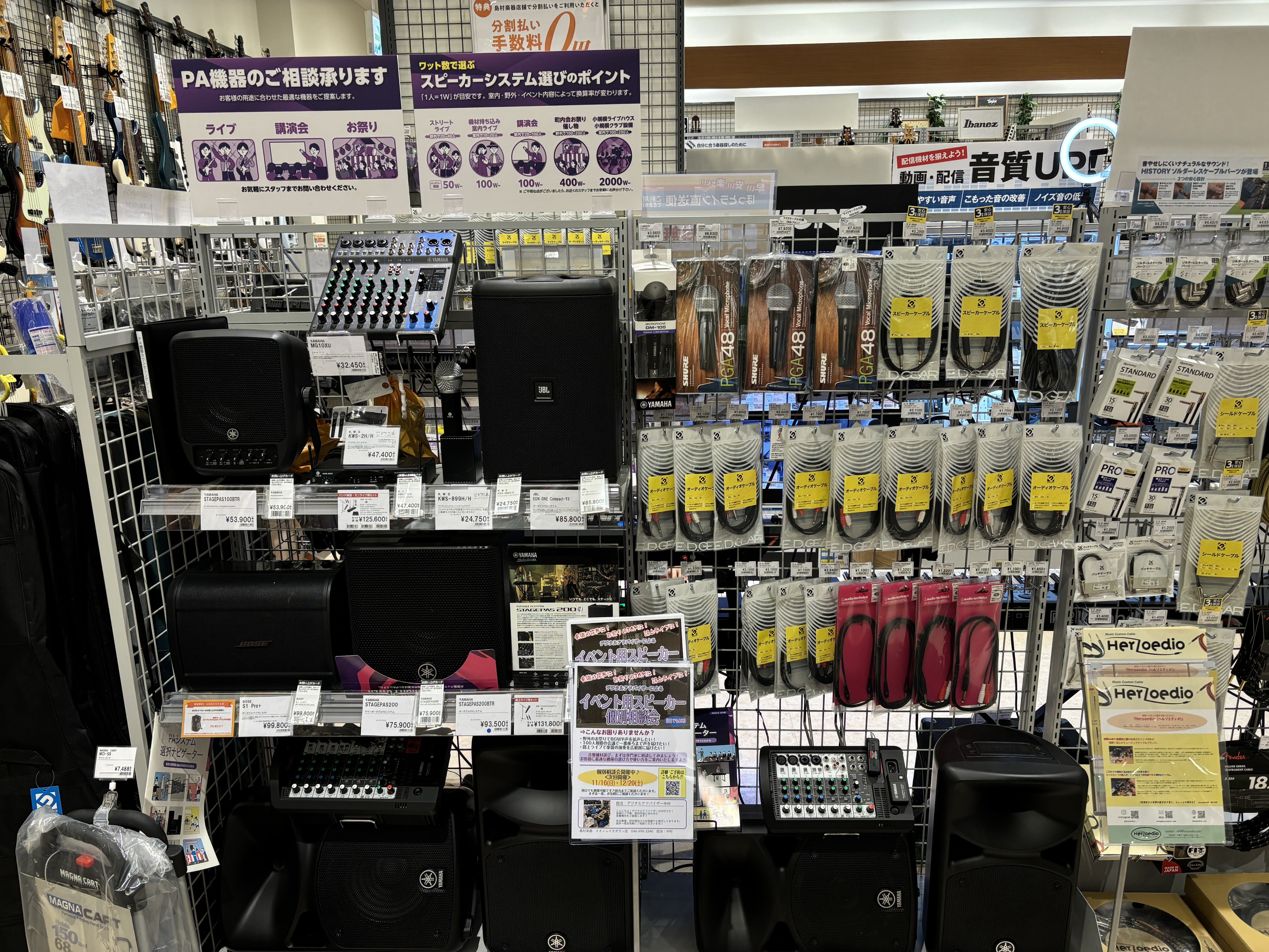 レイクタウン店では、ご自宅から催事場まで、様々な用途に合わせたPA機器を取り扱っております。